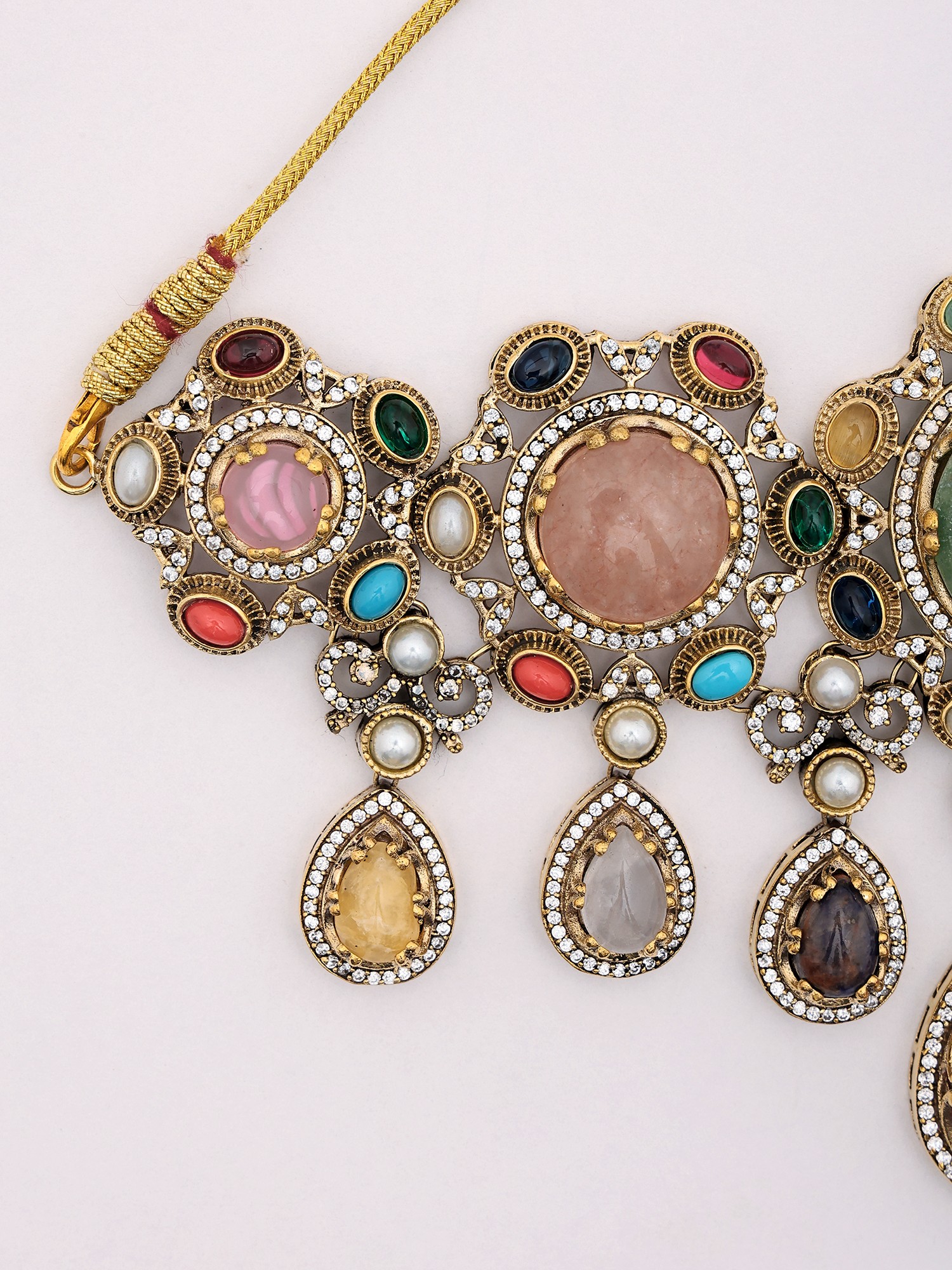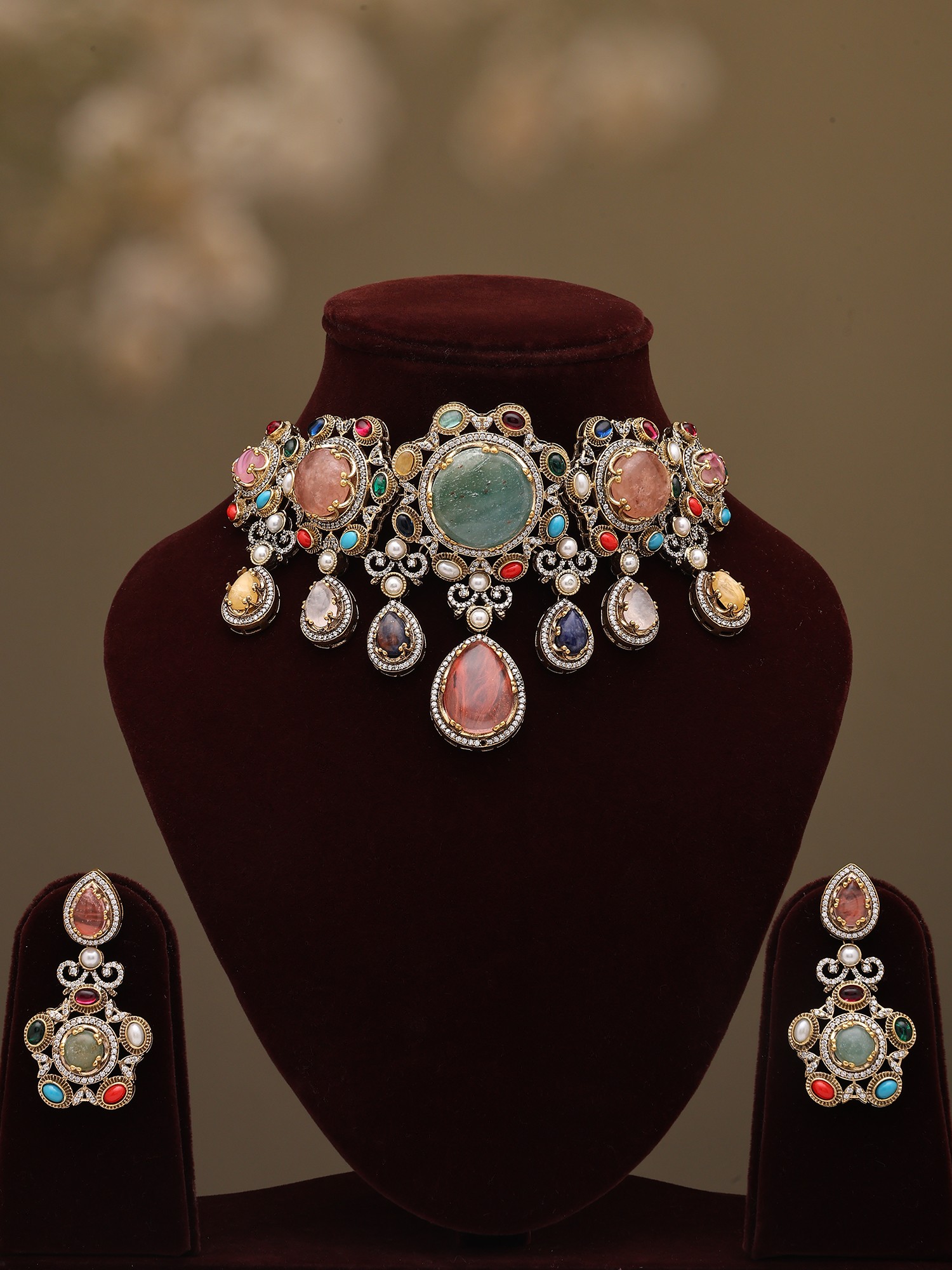 Multicolor Stone Studded Choker Necklace Set With Earrings