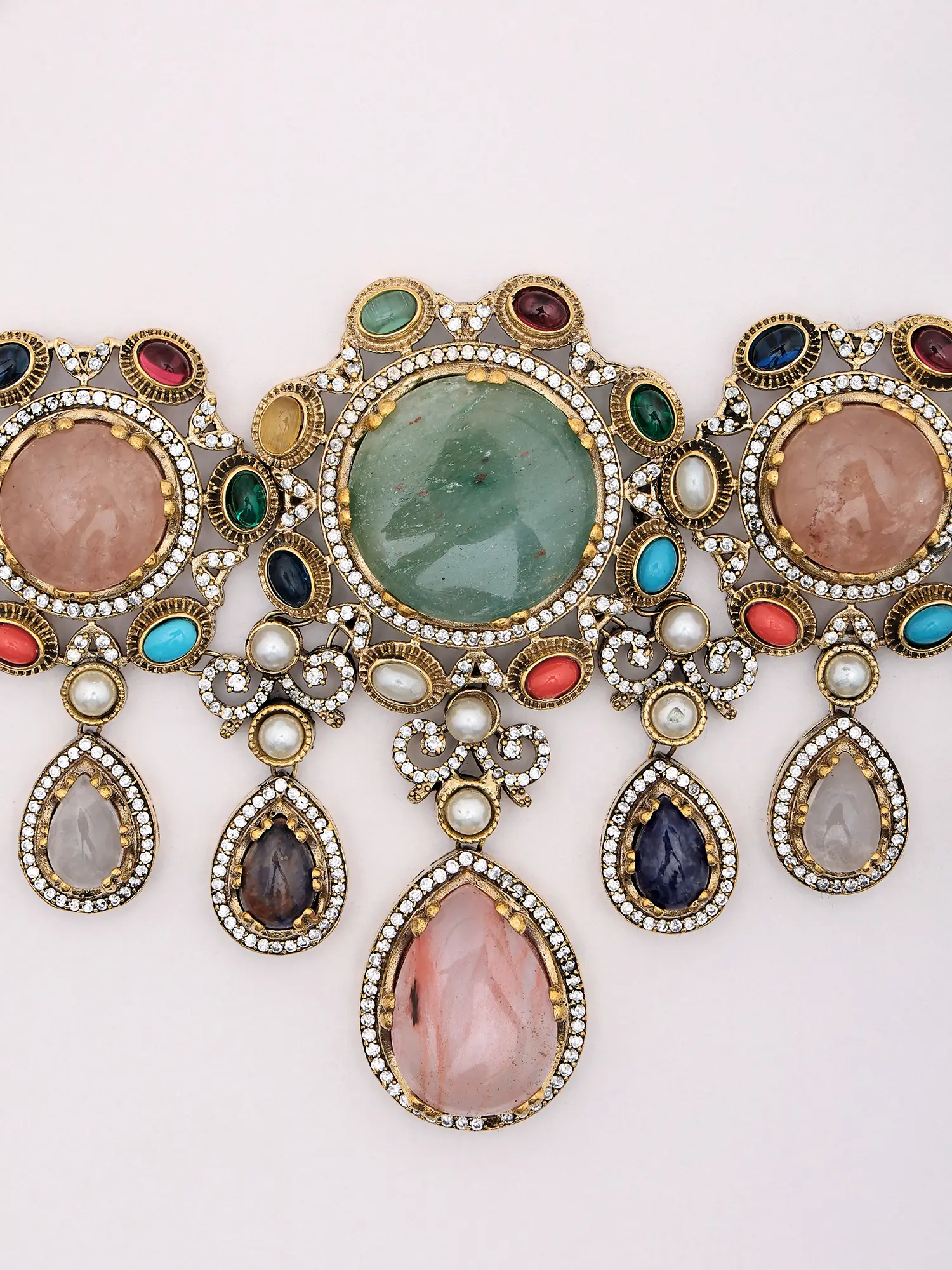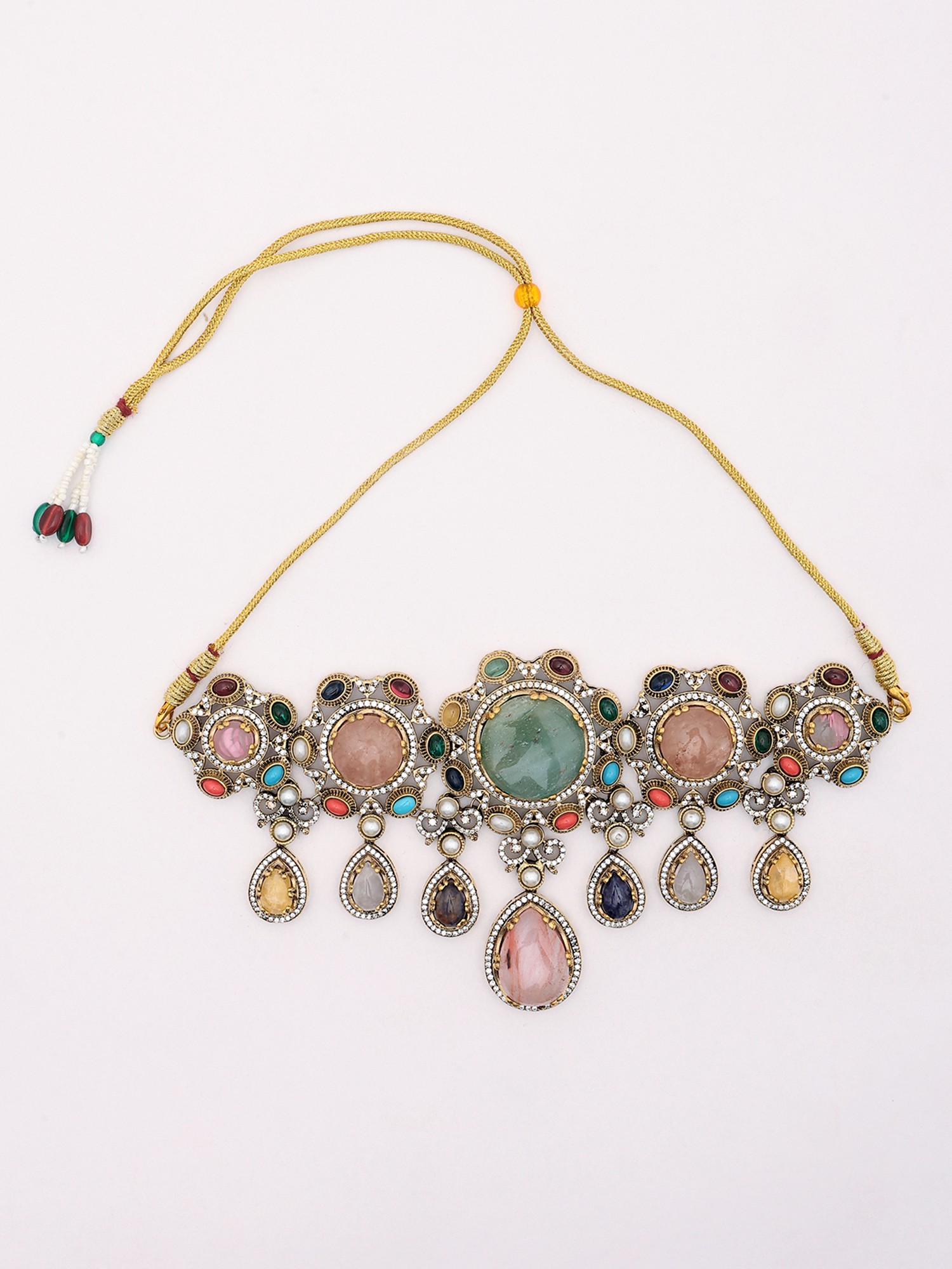 Multicolor Embellished Stone Studded Choker Necklace Set With Earrings