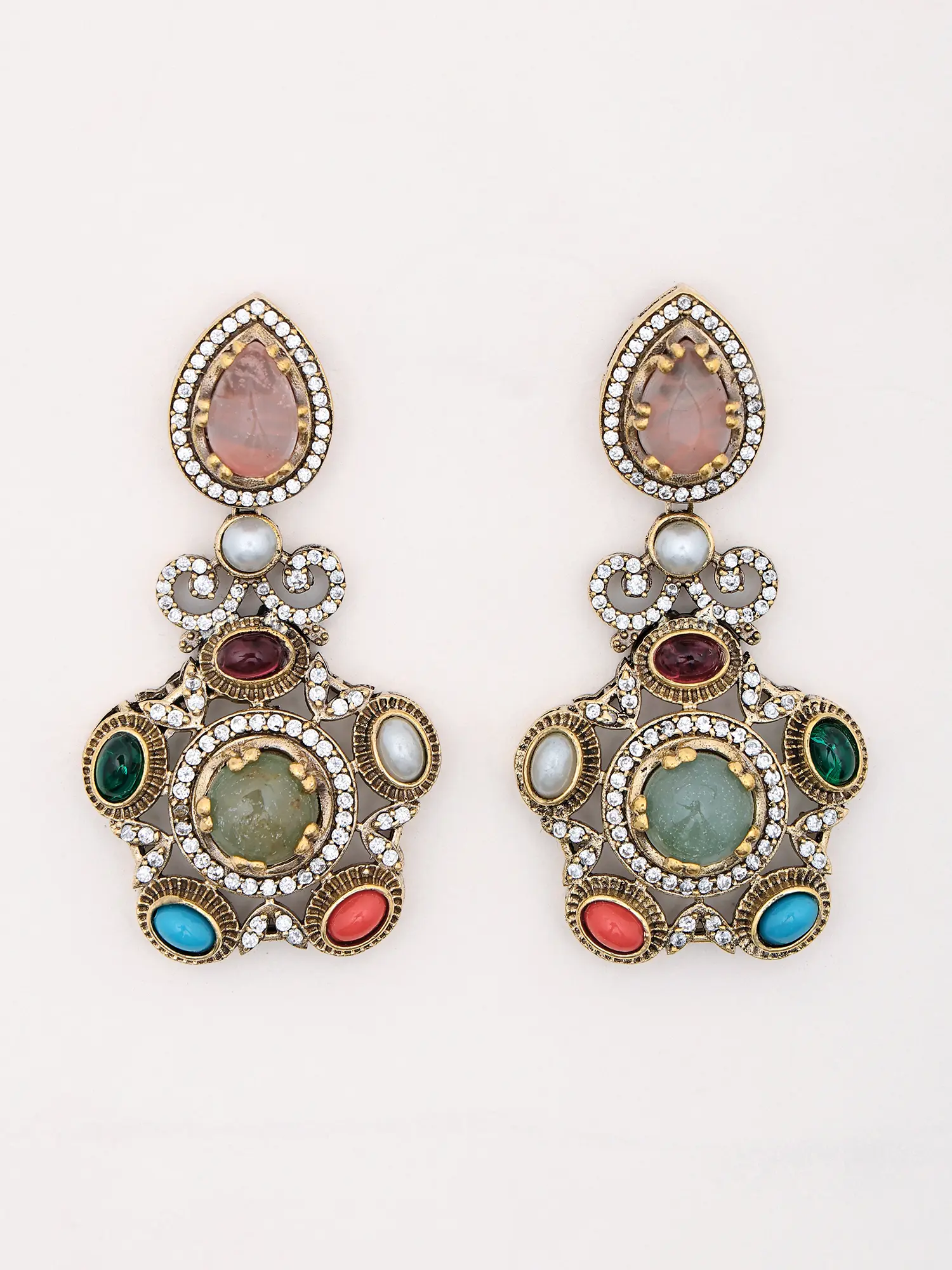 Multicolor Stone Studded Choker and Earrings Set with Drop Beads