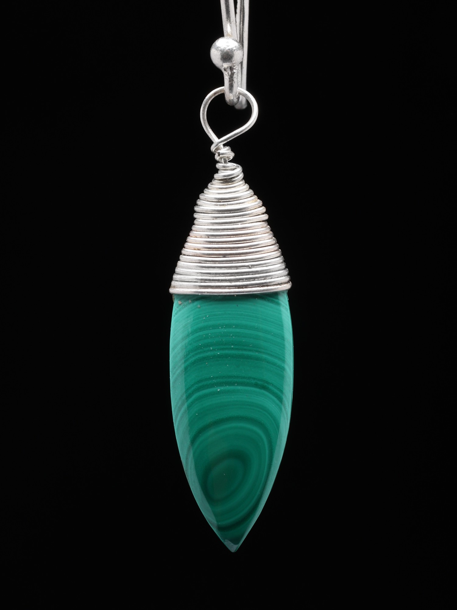 The malachite stones are gracefully held by intricately designed sterling silver. The wire-wrapped detailing adds a touch of modern sophistication, creating a striking contrast between the natural stone and the polished metal. The carefully crafted design ensures the stone is showcased, highlighting its inherent beauty. The sterling silver complements the green shades of the gemstone. These are suspended from classic hook ear wires, allowing for effortless wear and comfortable all-day elegance. The overall design is both timeless and contemporary, making these earrings a versatile addition to any jewelry collection.