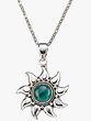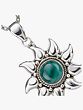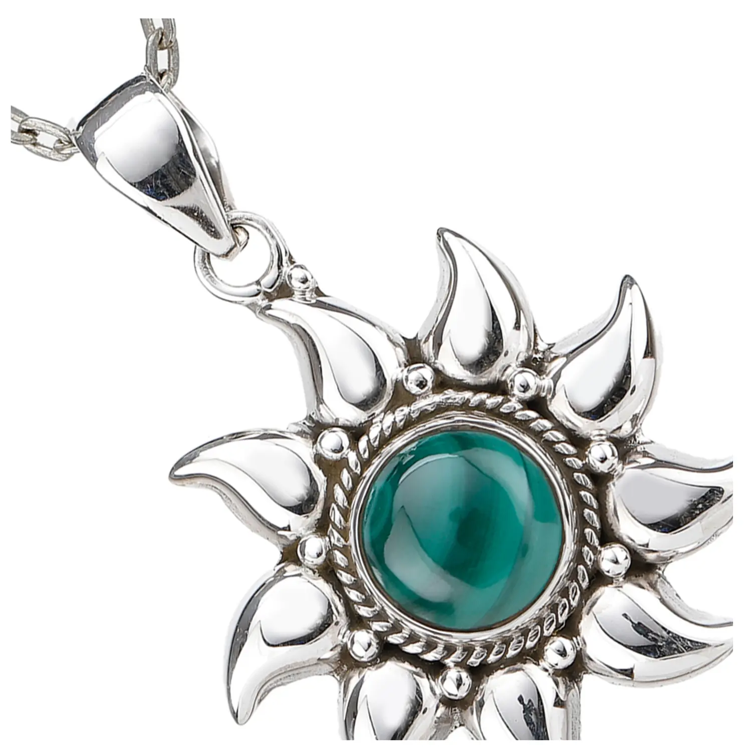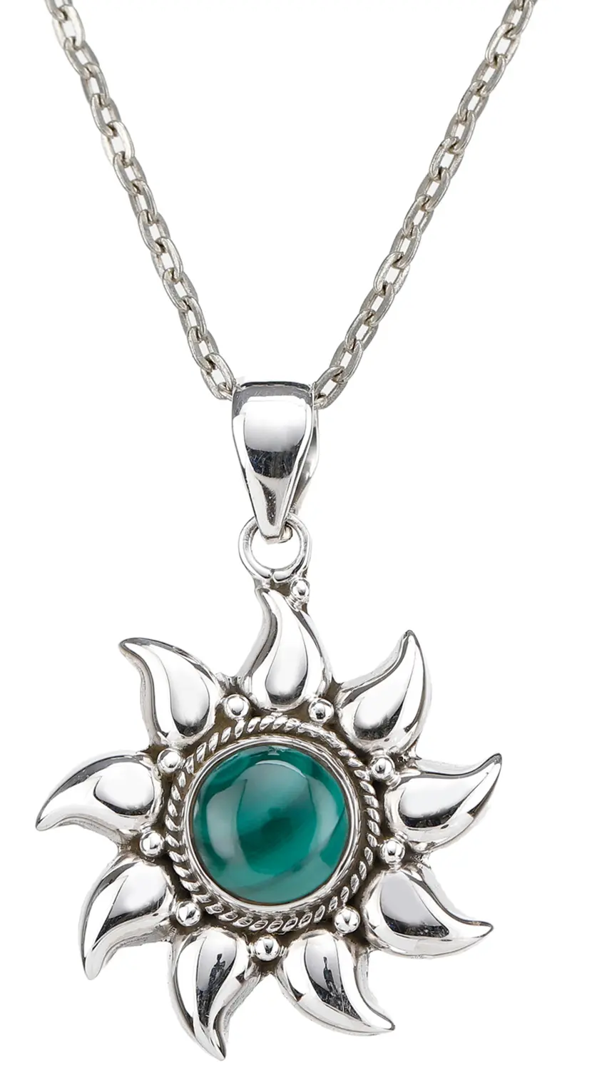 Surya’s name translates to “sun” in Sanskrit. This Malachite Sun Pendant is an elegant tribute to Surya’s name and icon, the shape of the sun. The sun being the brightest sun closest to earth makes it a great subject to art pieces and even jewelry. Its iconic shape and rays lend elegance to jewelry pieces such as this Malachite Sun Pendant. Aside from its beautiful shade, the precious stone malachite is believed to balance the heart chakra. It is also called the “stone of transformation” and is often worn to help with energy cleaning. Just as the sun signals a fresh start to the day, let the malachite’s power be a way to renew and reset the emotion and vigor. The pendant of this necklace is set in sterling silver with 9 sunrays and braid-like finish circling the malachite stone.