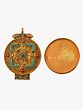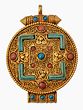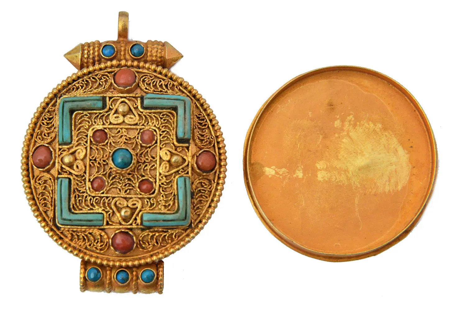 The central mandala design, with its layered geometric patterns and auspicious symbols, draws the eye and sparks contemplation. Flanked by four L-shaped segments inlaid with striking turquoise, the composition is balanced and harmonious. Scattered crimson coral cabochons and small golden spheres add pops of contrasting color and texture, enriching the visual narrative. Measuring approximately 1.8 inches in height and 1.5 inches in width, it possesses a commanding yet graceful presence.