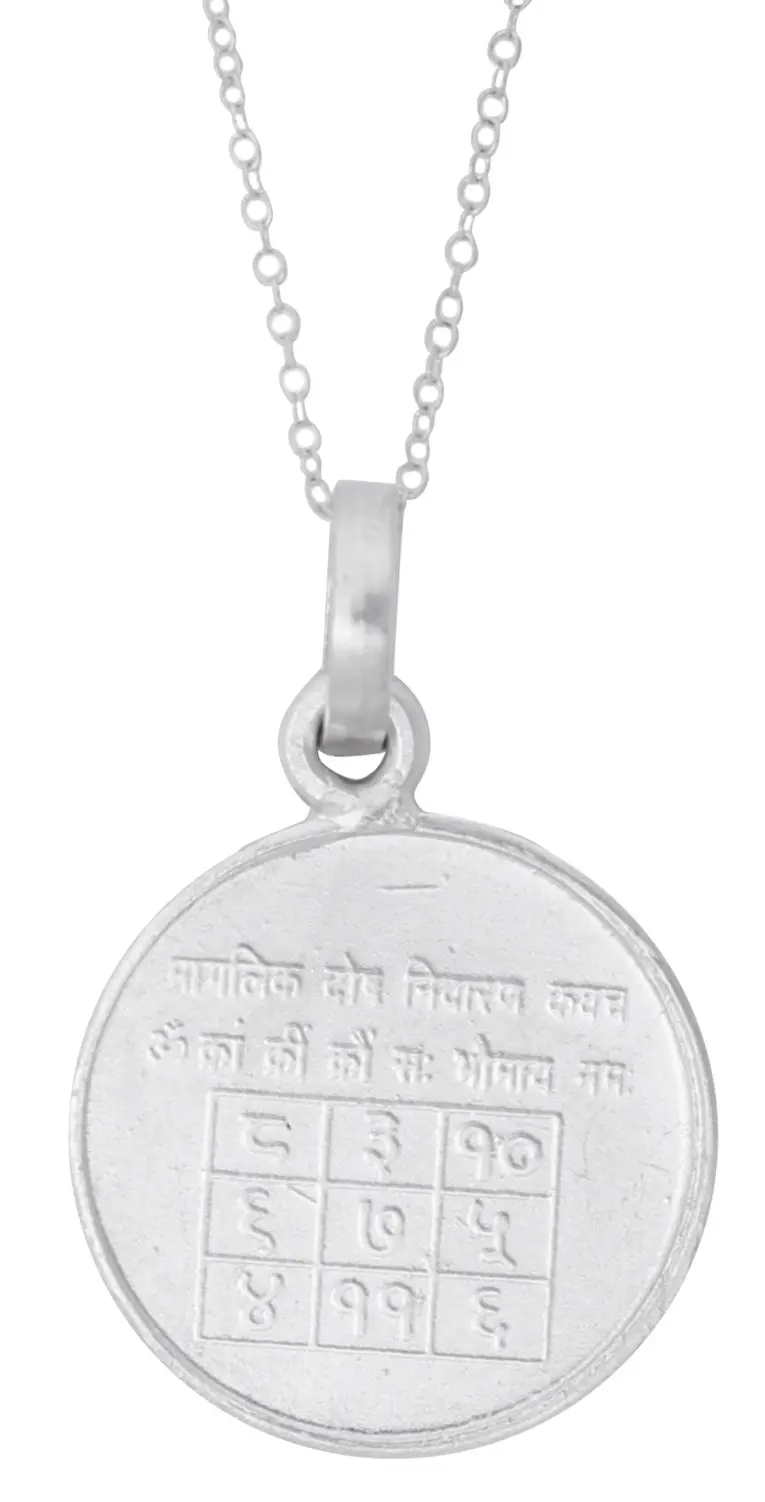 Discover a piece that resonates with spiritual significance and exquisite craftsmanship. This pendant, crafted from fine silver, is more than just an accessory; it's a symbol of protection and well-being. The circular design features intricate engraving, including a sacred geometric pattern at its center, enclosed by meaningful script. This yantra is traditionally associated with mitigating negative astrological influences, promoting balance, and attracting positive energies into one's life.