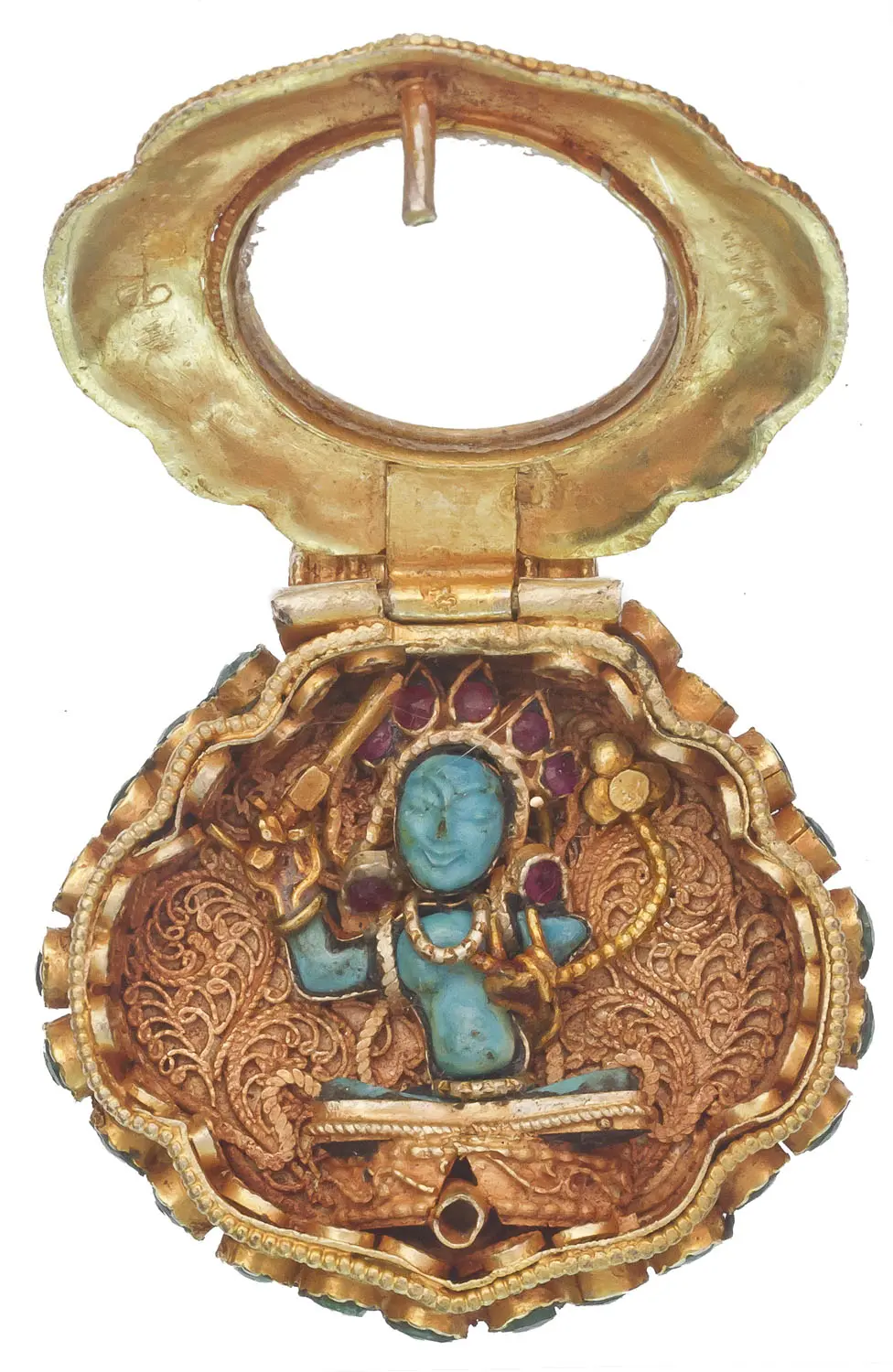 At its heart lies a captivating miniature depiction, its vibrant turquoise hue drawing the eye. Rich gold detailing accentuates the divine form, hinting at the blessings and spiritual presence it represents. Accents of deep red gemstones add further depth and visual interest, creating a harmonious interplay of color and light. The generous 1.9-inch height and 2.0-inch width ensure this piece makes a statement, while its finely wrought golden border, embellished with delicate scrollwork and beaded trim, frames the sacred imagery with timeless elegance.