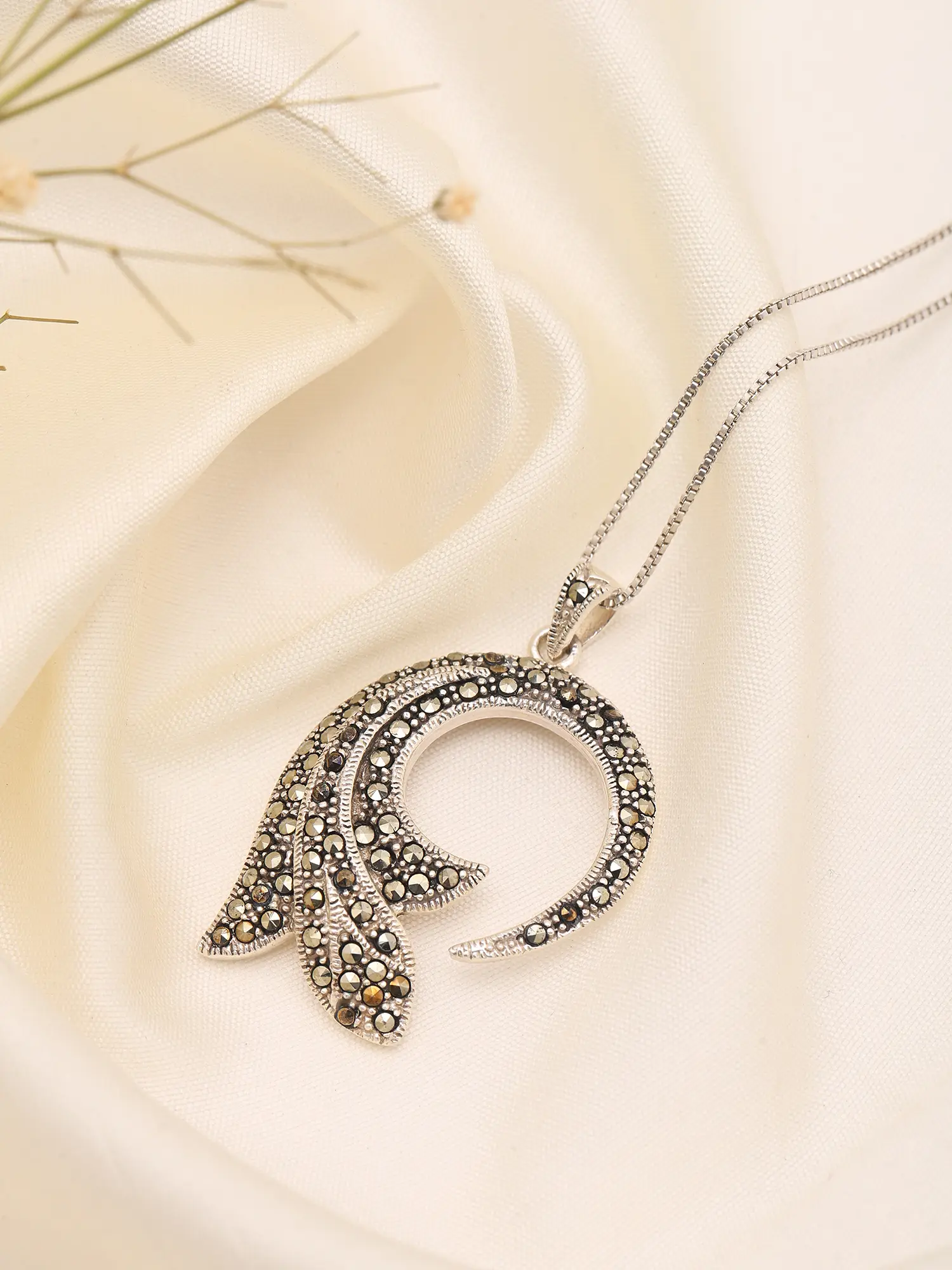 Features a striking crescent moon design adorned with sparkling marcasite stones.
