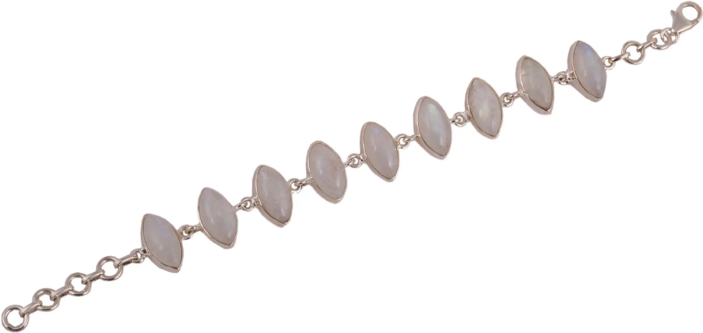 Exotic India is proud to present this dazzling bracelet in Sterling Silver and Rainbow Moonstone due to the wonderful properties that these two materials embody. Rainbow Moonstone has been in spiritual use for over 2,000 years in India, channeling the mysterious qualities of the moon such as intuition, lucid dreams and the natural rhythms of Nature. Rainbow Moonstone can be used by any individual wanting to dive into a deeper relationship with their own soul and learn what hidden secrets lie there waiting to be revealed. In addition, the Sterling Silver supporting these Rainbow Moonstones has been used to reflect negative energies and to help access difficult emotions. Silver contains and nurtures healthy energies it is given. Order our Sterling Rainbow Moonstone Marquise Bracelet now and feel your natural intuition rising up in your soul.