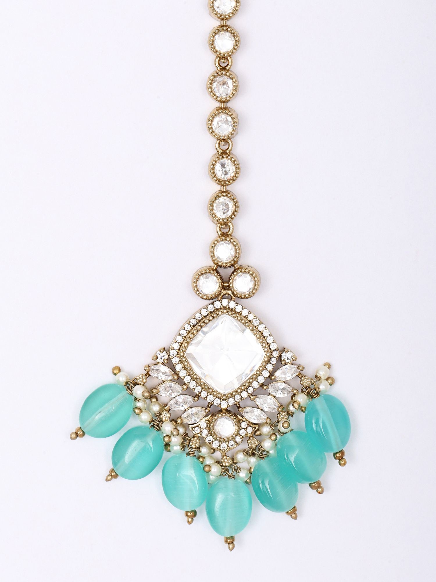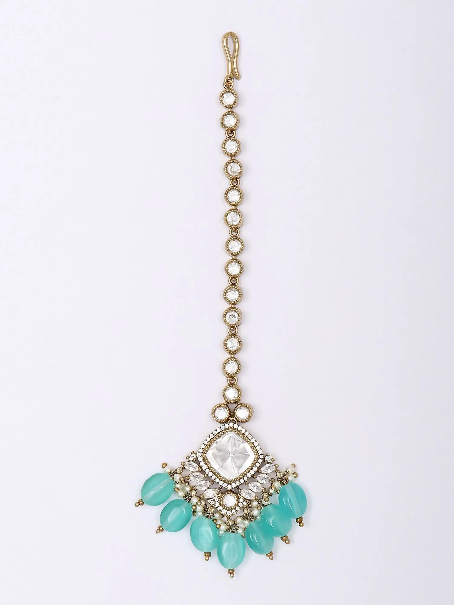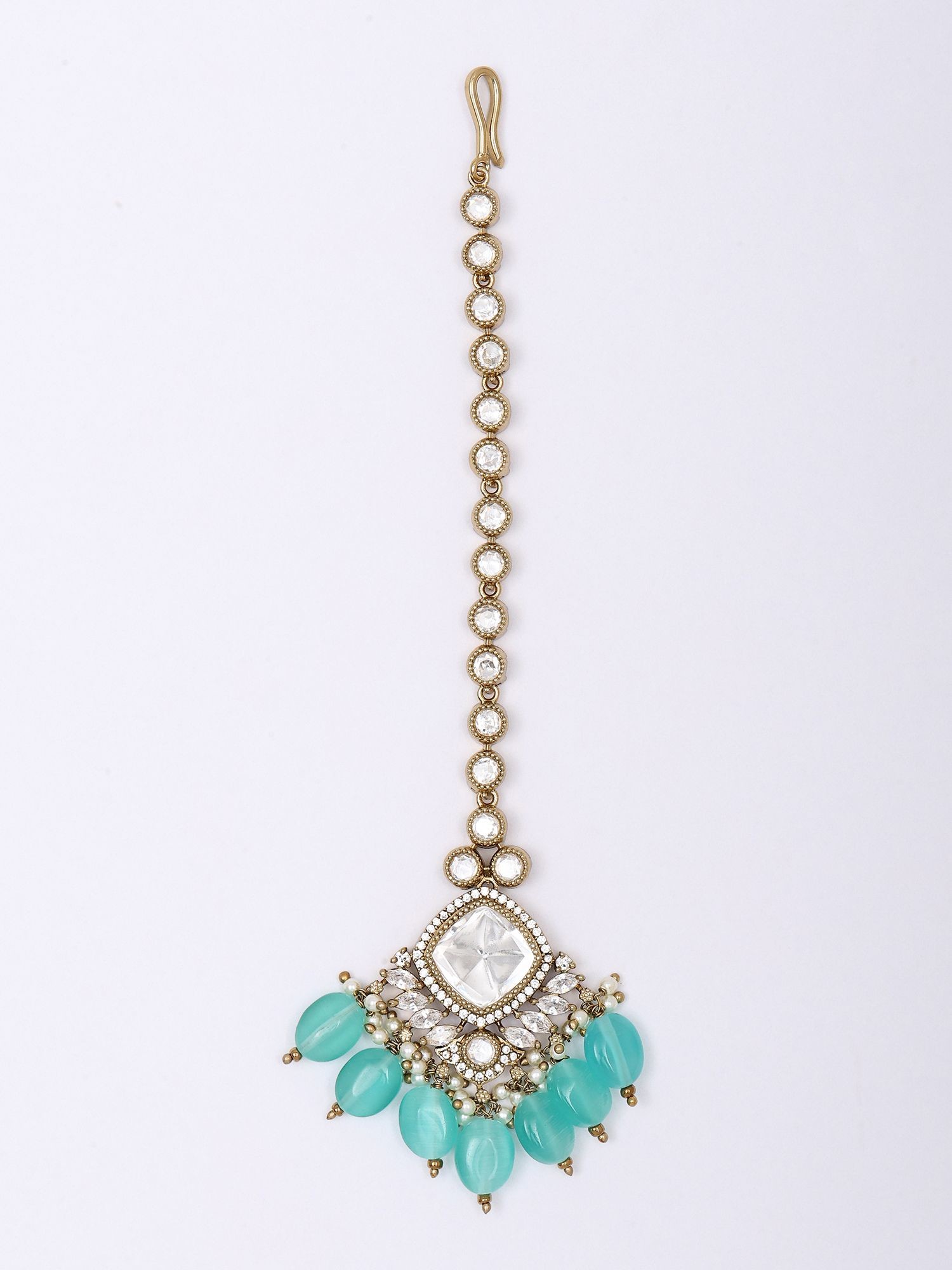 Stone Studded Kundan Meenakari Crescent Style Maang Tikka with Bead Drops
