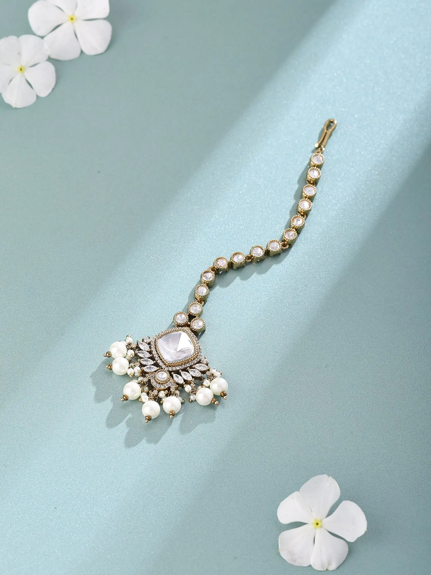 Floral Moon Polki Studded Maang Tikka with Pearl Drop