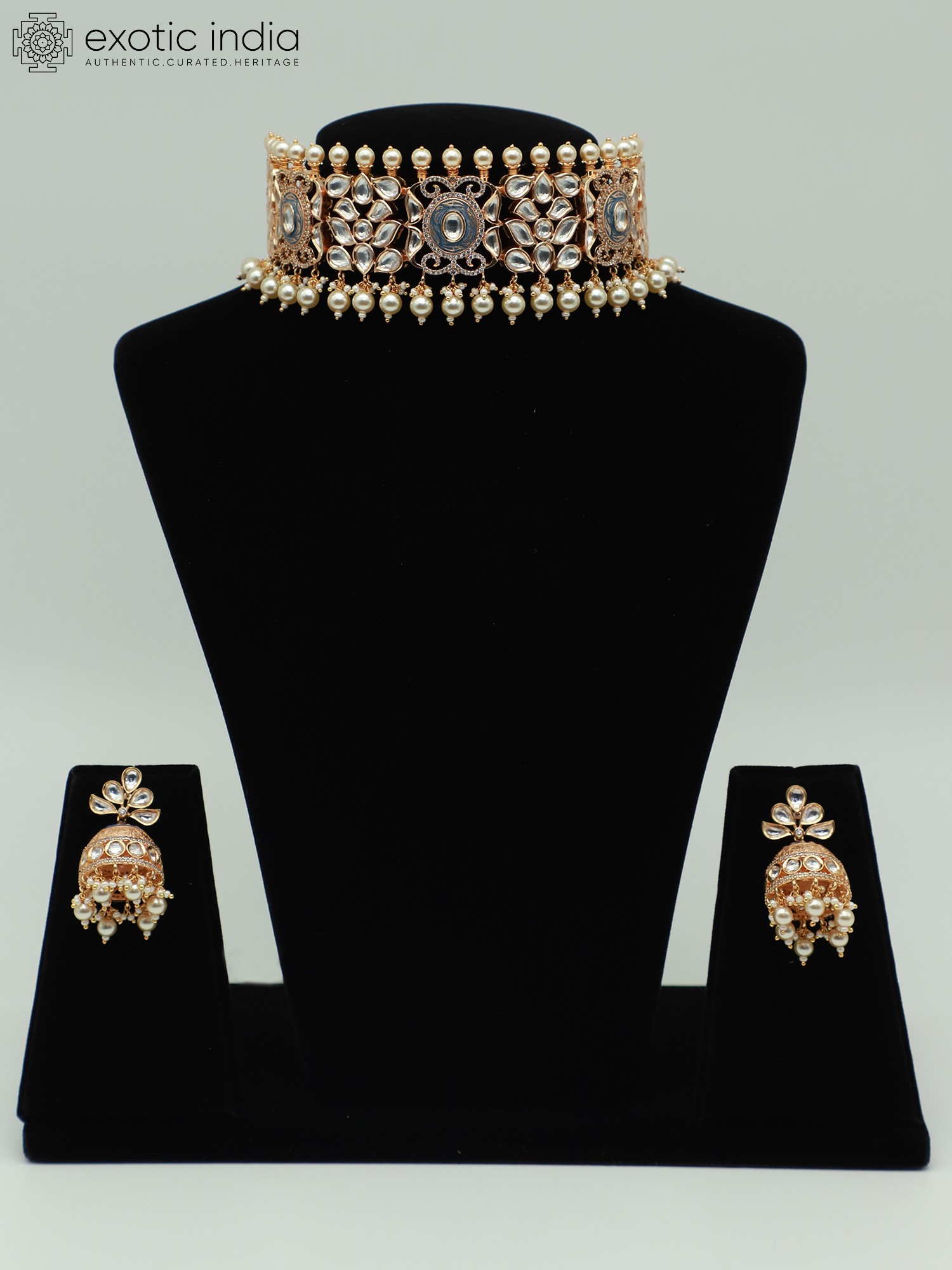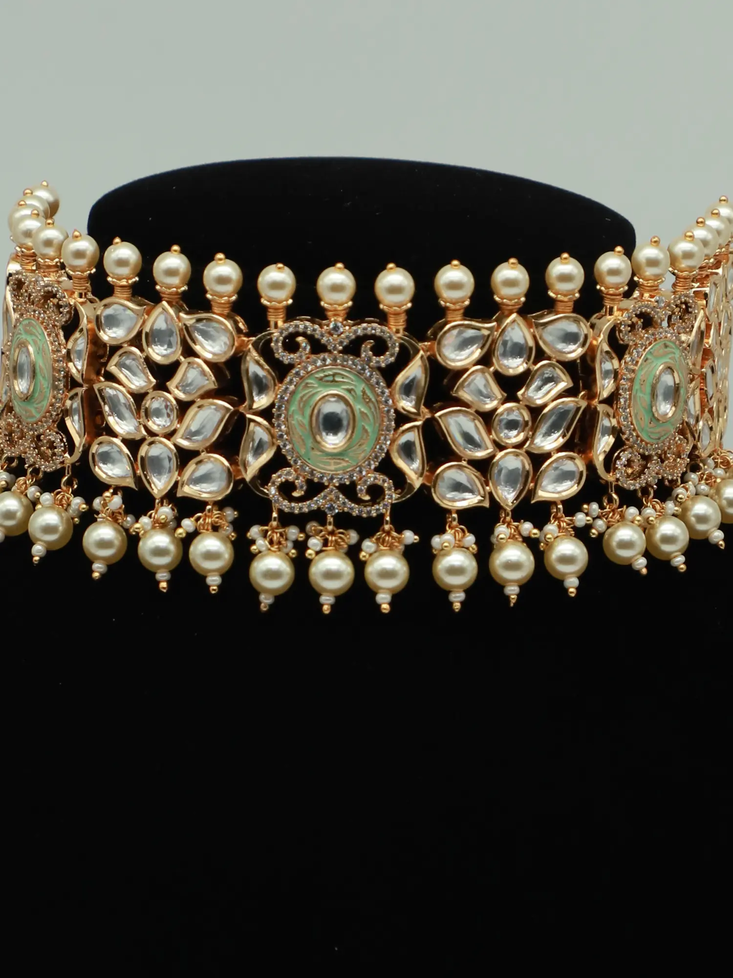 This choker set is versatile enough to complement a variety of outfits. Pair it with a traditional saree or lehenga for a classic Indian look, or wear it with a contemporary dress for a fusion style statement. The subdued color palette makes it easy to coordinate with different colors and fabrics. For a bridal look, this set would be stunning with a red or maroon outfit, adding a touch of timeless elegance. For a more casual event, try pairing it with a simple kurta or tunic to elevate your everyday style. This jewelry set is sure to be a cherished addition to your collection, bringing a touch of Indian heritage and artistry to your personal style.