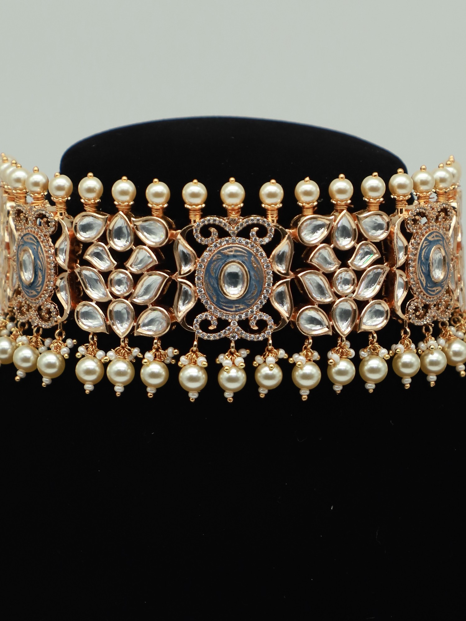 The choker's broad design is adorned with multifaceted stones that catch the light beautifully, creating a subtle sparkle. Each stone is meticulously placed within a framework, showcasing a floral-inspired motif. Small faux pearls delicately dangle along the lower edge of the choker, adding a touch of softness and movement to the bold design. The matching earrings echo the same design elements, with clustered faux pearls suspended from the base, creating a harmonious and complete look. The matte finish of the metal adds a subtle sheen, enhancing the overall sophistication of the set. The choker sits comfortably around the neck, while the earrings are designed for secure and comfortable wear.