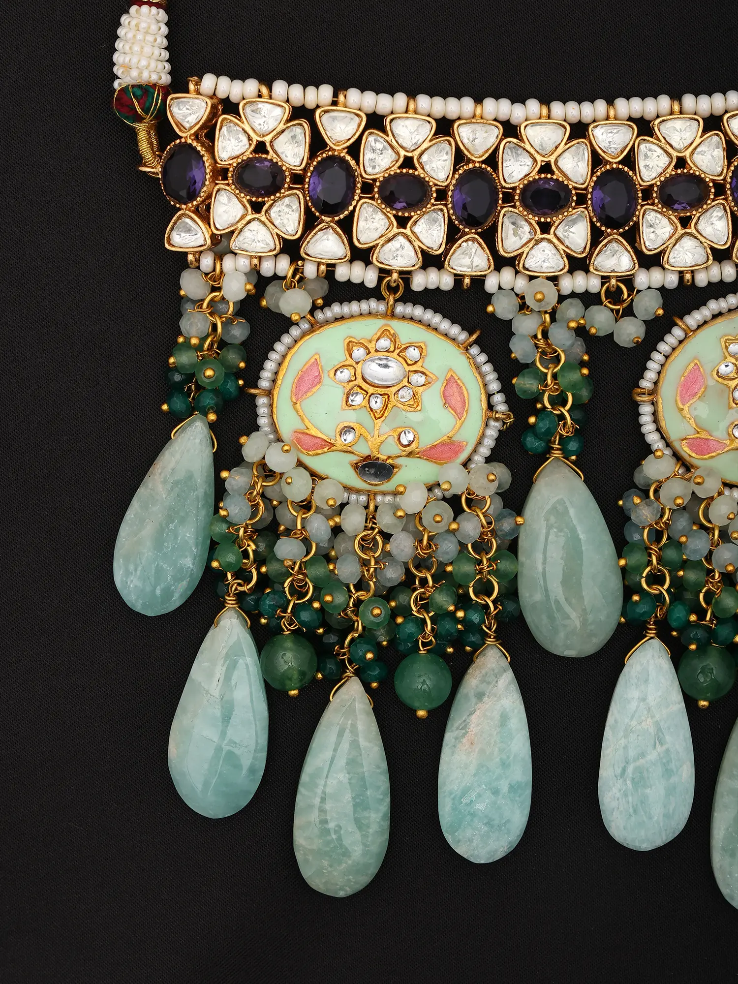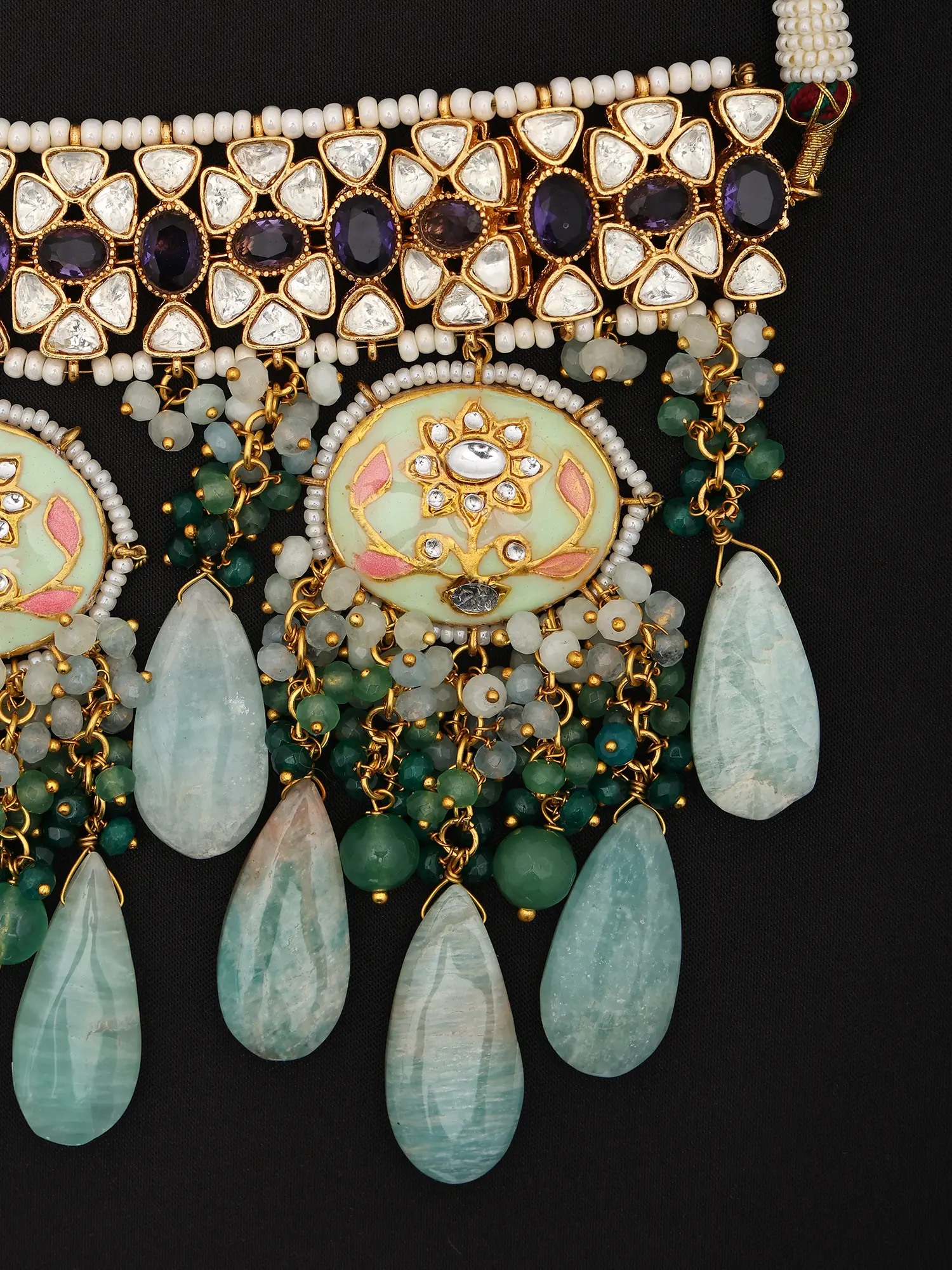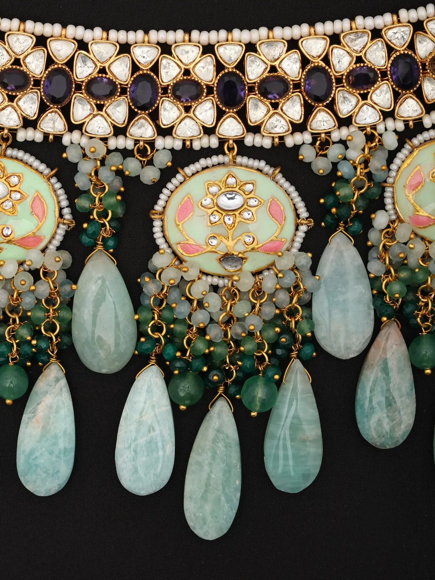 The heart of this ensemble lies in its stunning Meenakari work. Delicate floral motifs, rendered in soft pastel hues, are intricately hand-painted onto polished enamel, creating a visual delight. These central elements are further enhanced by a cascade of natural stones, creating a breathtaking dance of color and light. Pear-shaped drops of serene aquamarine hues mingle with lush green beads, evoking the beauty of nature's finest jewels. The interplay of these vibrant stones against the rich backdrop of the Meenakari creates a piece that is both opulent and gracefully feminine.