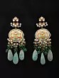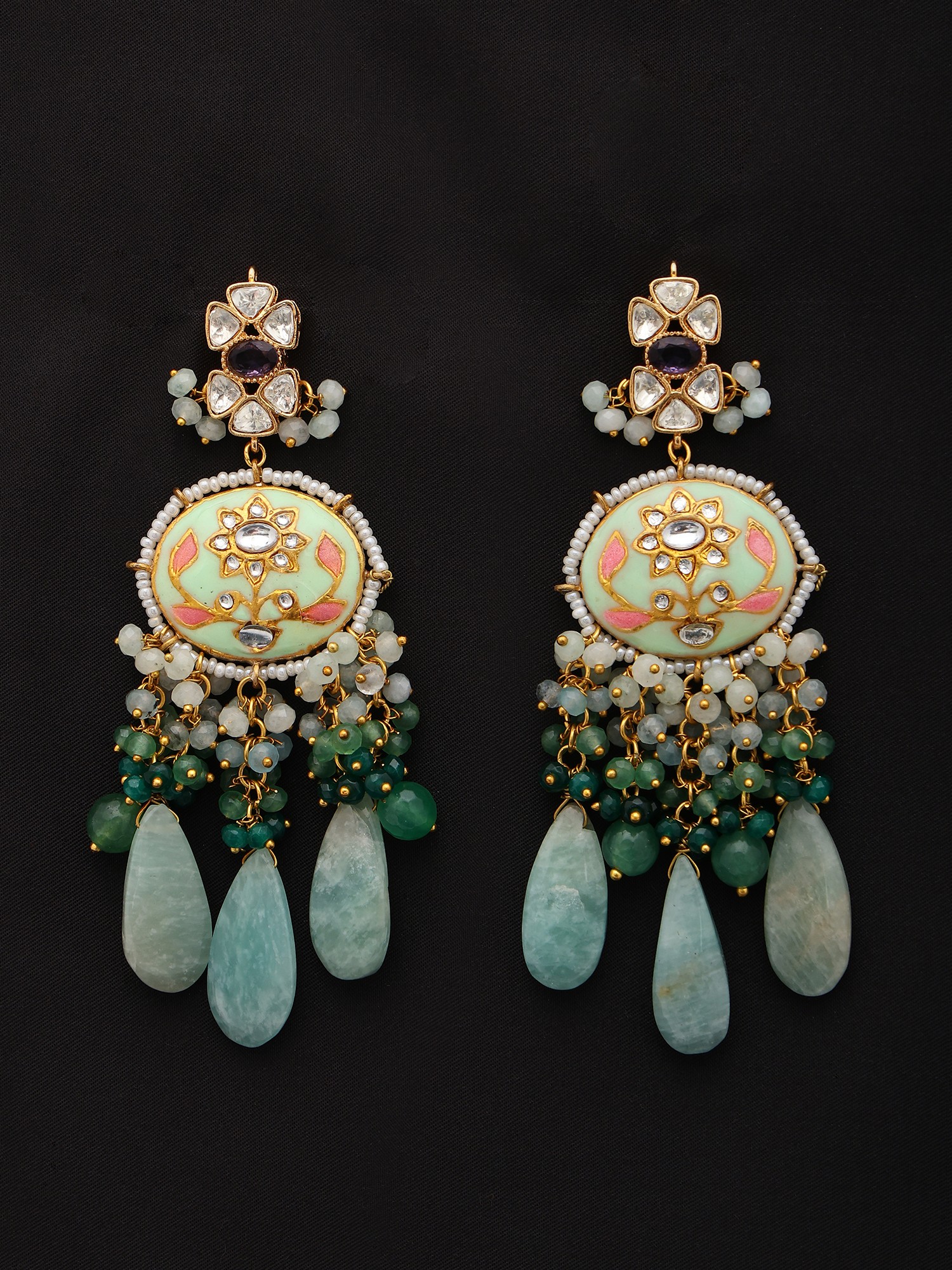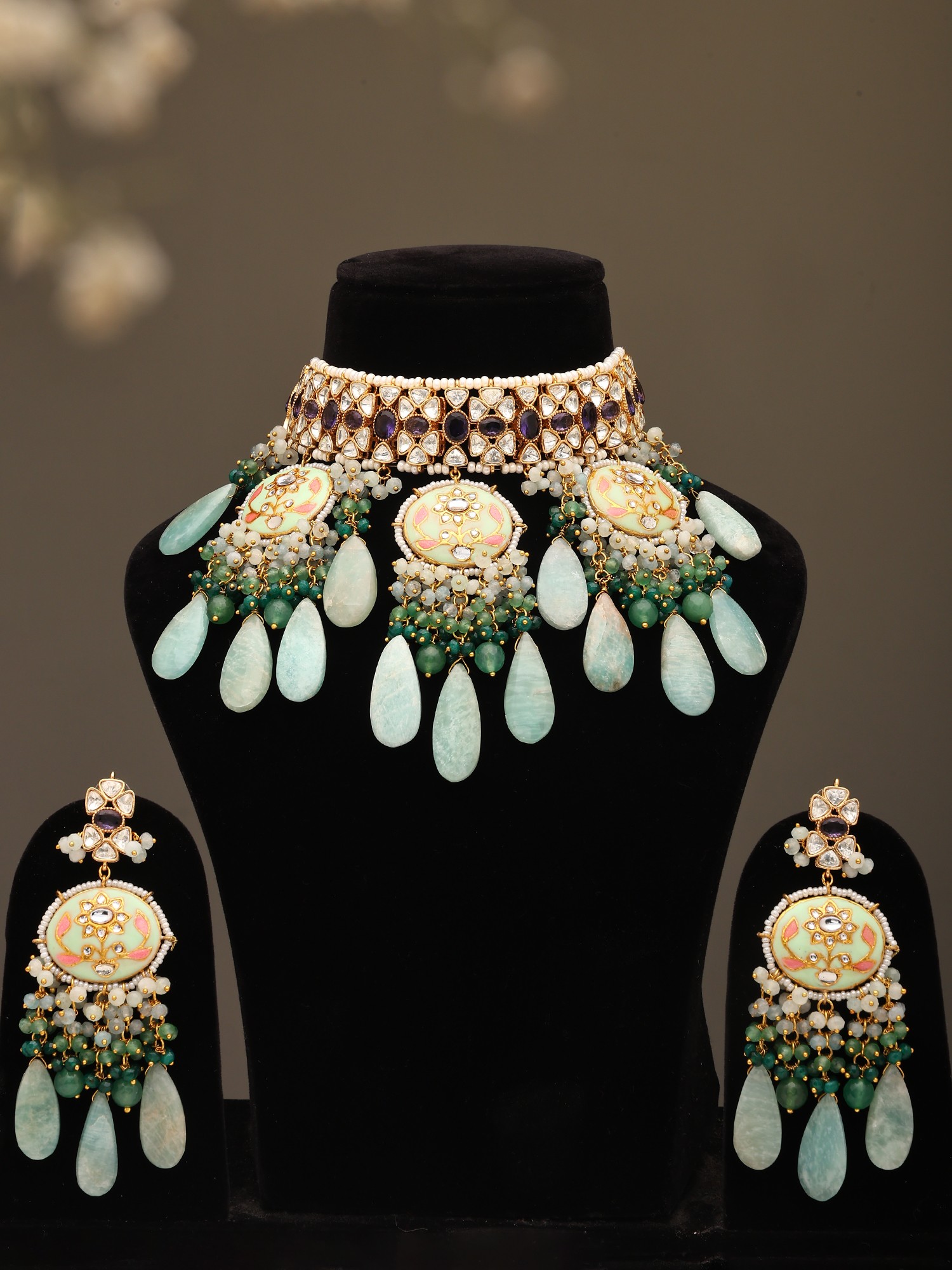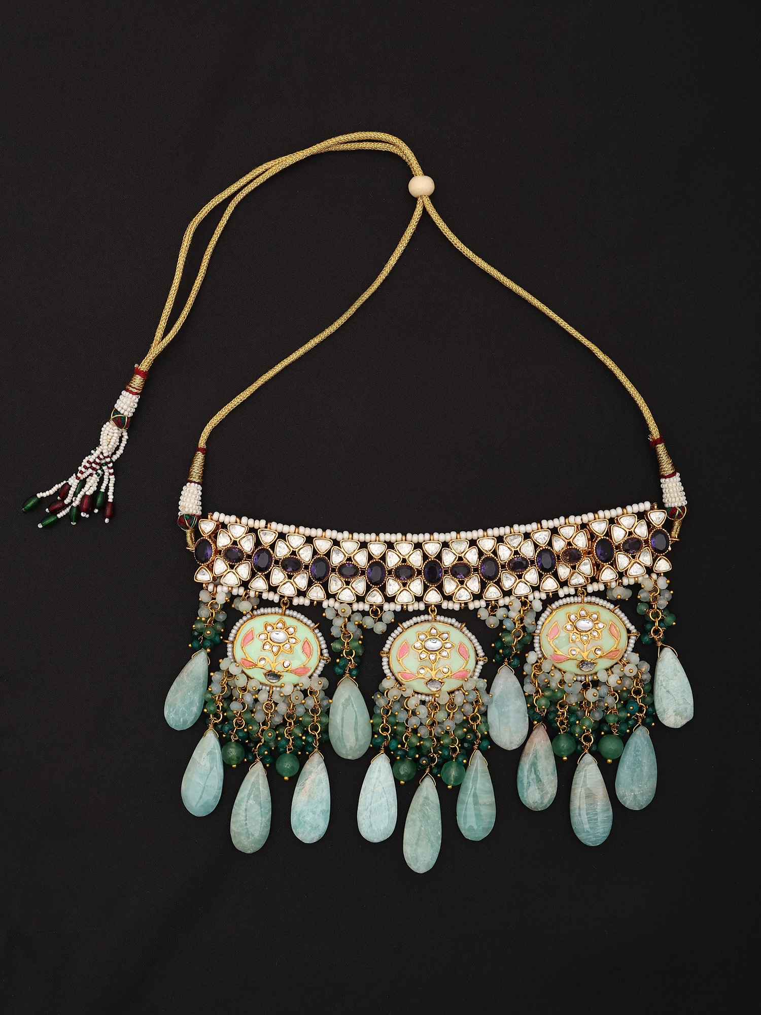 The heart of this ensemble lies in its stunning Meenakari work. Delicate floral motifs, rendered in soft pastel hues, are intricately hand-painted onto polished enamel, creating a visual delight. These central elements are further enhanced by a cascade of natural stones, creating a breathtaking dance of color and light. Pear-shaped drops of serene aquamarine hues mingle with lush green beads, evoking the beauty of nature's finest jewels. The interplay of these vibrant stones against the rich backdrop of the Meenakari creates a piece that is both opulent and gracefully feminine.
