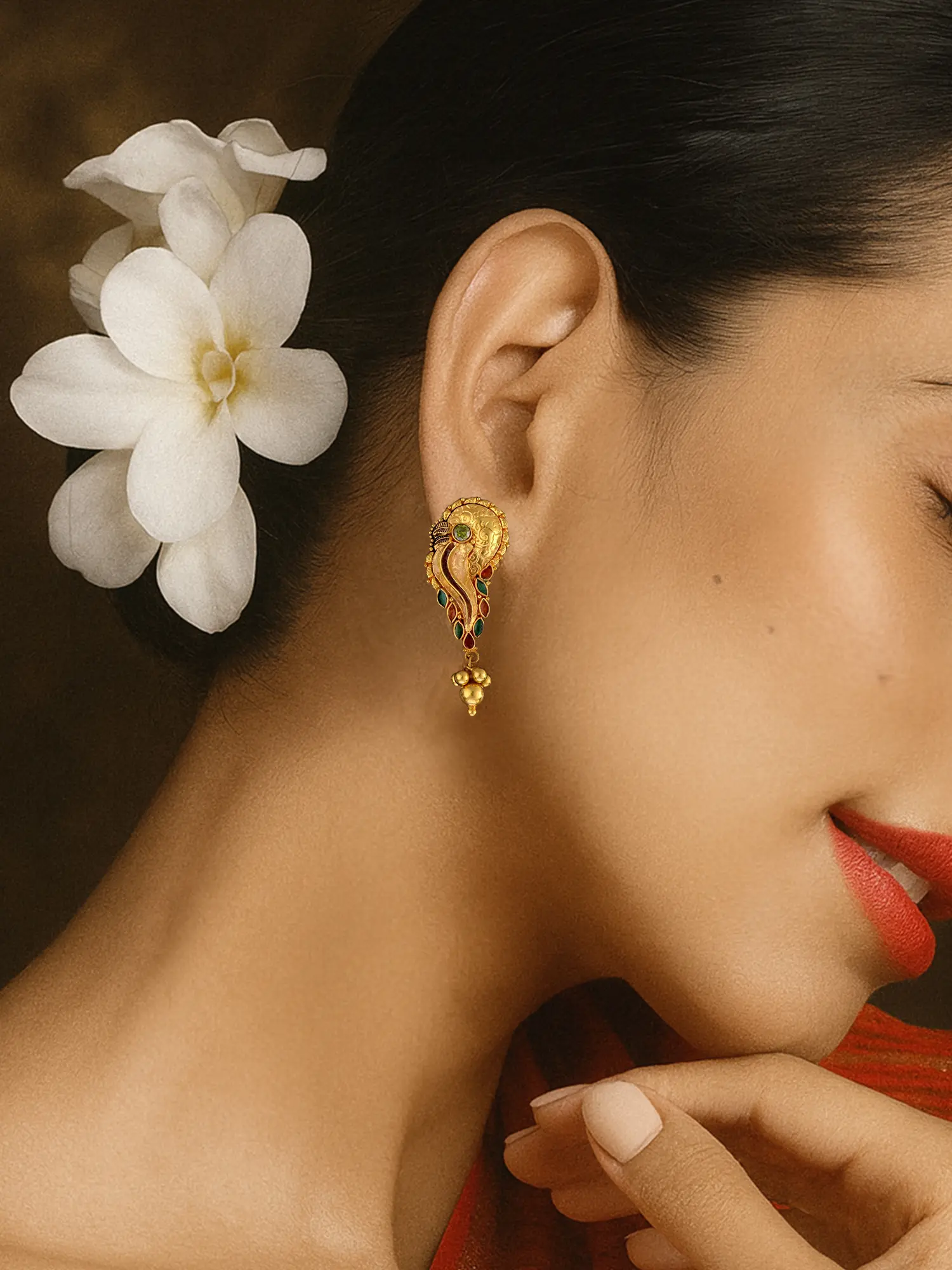 Exotic India brings forth the stunning pair of skilfully handcrafted Meenakari Mayuri earrings made with 18k gold. The pair will certainly add a dash of vibrancy and grace to your looks. A captivating combination of green and red meenakari work in a peacock motif outlined with intricate gold work is mesmerising. The round gold beads dangling at the end makes it all the more alluring. The earrings are aligned with a perfect closure that will secure the earring to your ears. The design of earrings is a fusion of tradition and modernity which gives a contemporary edge to it. This beautiful pair of earrings will give an amazing grandeur to your aura and personality.