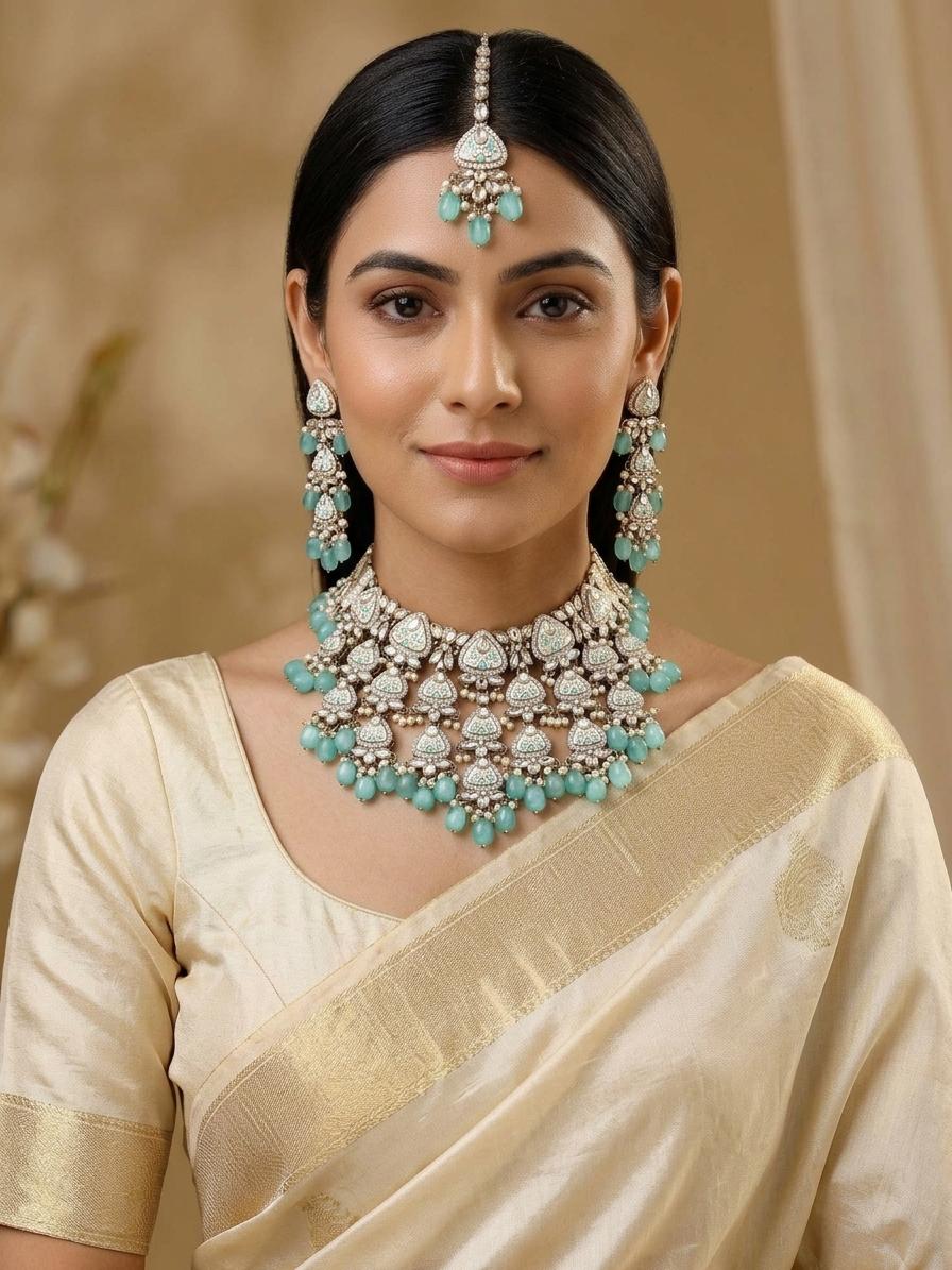 Mint Green Choker Necklace Set with Earrings and Mangtika