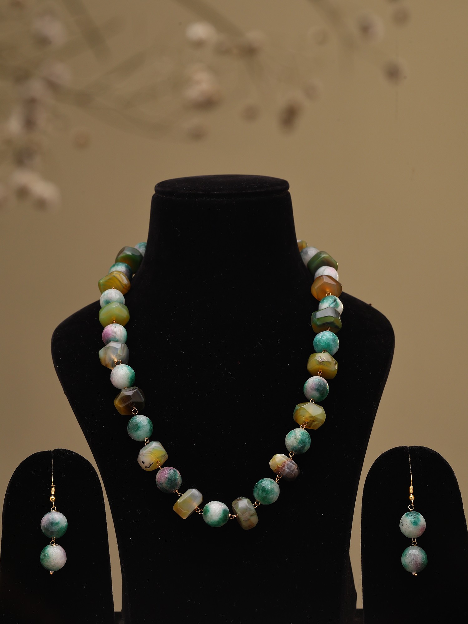Completing this captivating set are the accompanying drop earrings. Mirroring the design of the necklace, each earring features a delicate string of similarly hued beads, culminating in a gentle dangle that adds graceful movement. The earrings are designed to be noticeable yet understated, providing a perfect balance to the statement necklace. They echo the natural, free-spirited vibe of the necklace, ensuring a cohesive and beautifully curated look. Wearing this set is like carrying a piece of the natural world with you, a reminder of its beauty and tranquility.