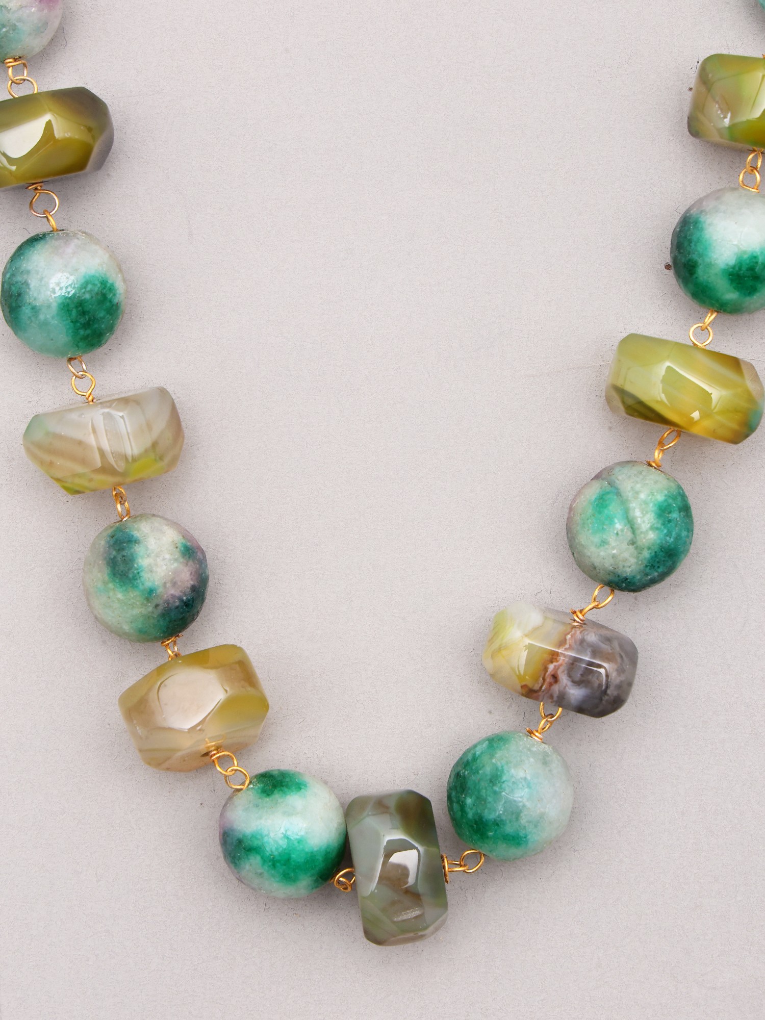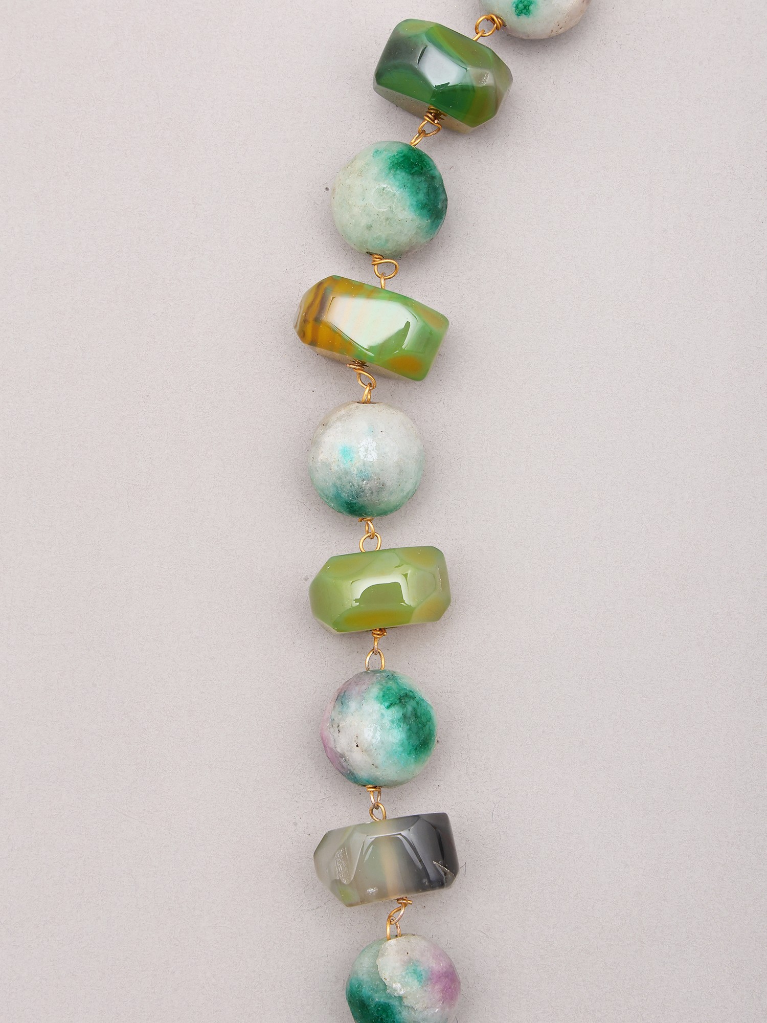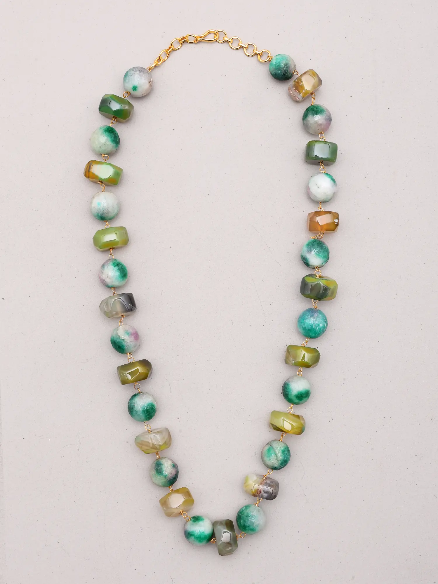 The necklace is a true celebration of verdant shades. You'll find a spectrum of mossy greens, deep emeralds, and translucent jade tones, all harmoniously blended. Some beads boast intriguing faceting, catching the light and adding subtle sparkle, while others offer a smoother, more rounded form, providing a pleasing contrast. Hints of soft pink and warm amber peek through the green, reminiscent of wildflowers or the dappled light filtering through a forest canopy. This thoughtful color palette makes the necklace incredibly versatile, effortlessly complementing a range of outfits, from casual daytime wear to more sophisticated evening ensembles.