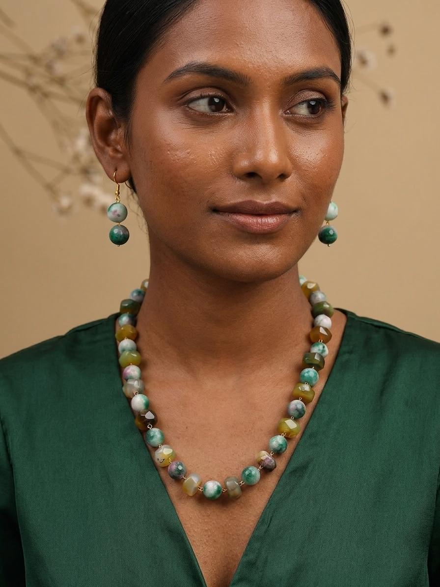 Discover a piece that captures the essence of nature's artistry. This exquisite jewelry set, featuring a stunning beaded necklace and perfectly matched earrings, is designed to bring a touch of organic beauty to your personal style. The necklace showcases a captivating array of naturally formed stones, each one unique in its shape and captivating green hues, interspersed with lighter, almost ethereal accents. These stones are carefully selected and strung together, creating a tactile and visually engaging piece that feels as good as it looks.