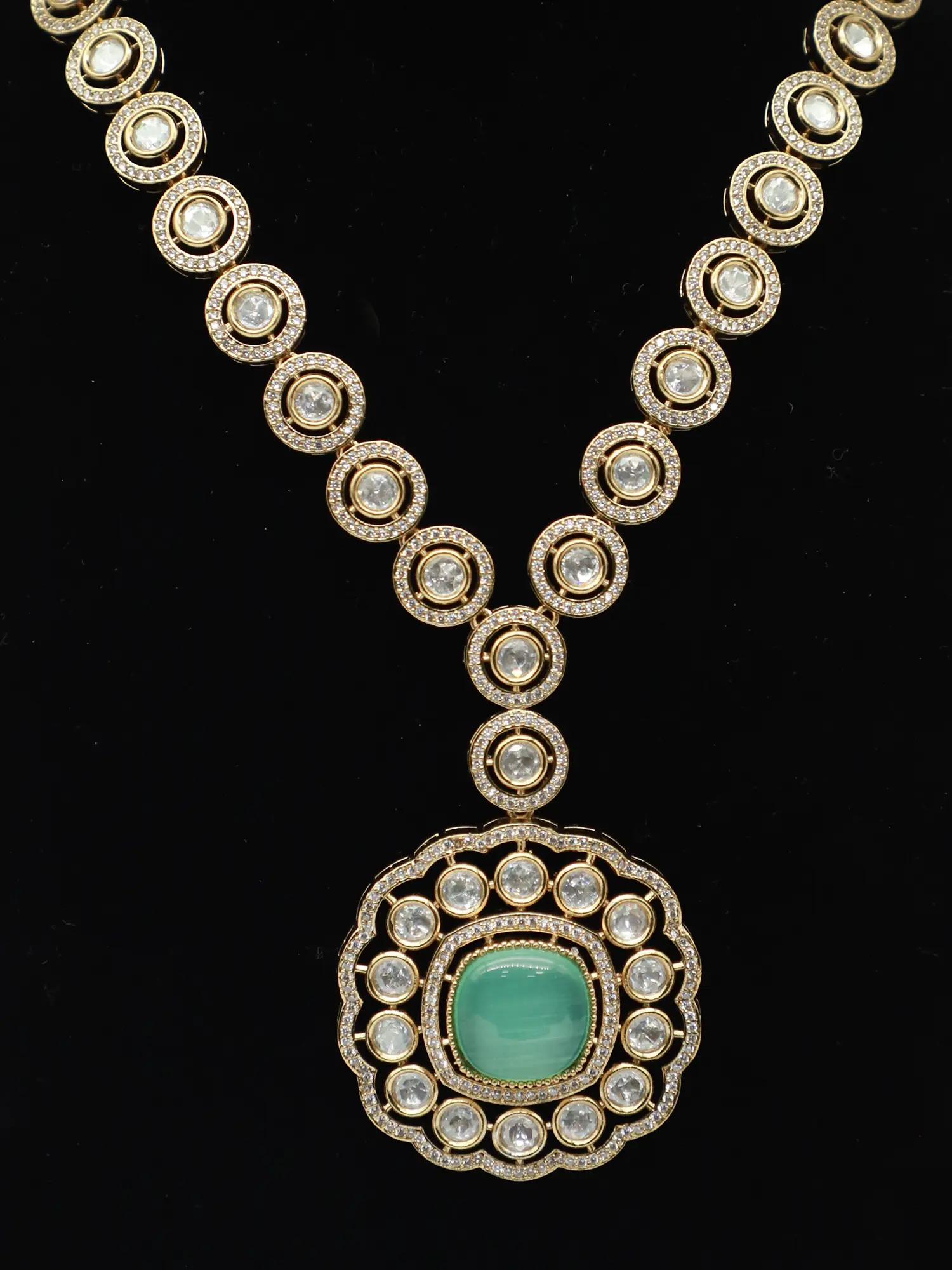 The focal point of the necklace is an artful arrangement of dazzling stones, each carefully selected and meticulously set to maximize its brilliance. The central pendant cascades gracefully from a string of beautifully embellished stones that adorn the neckline. The matching earrings mirror the design of the pendant, creating a cohesive and balanced aesthetic. The attention to detail is evident in every facet, reflecting the skill and dedication of the artisans who brought this set to life. The brass base adds a layer of durability, ensuring that this stunning set remains a cherished treasure for years to come.