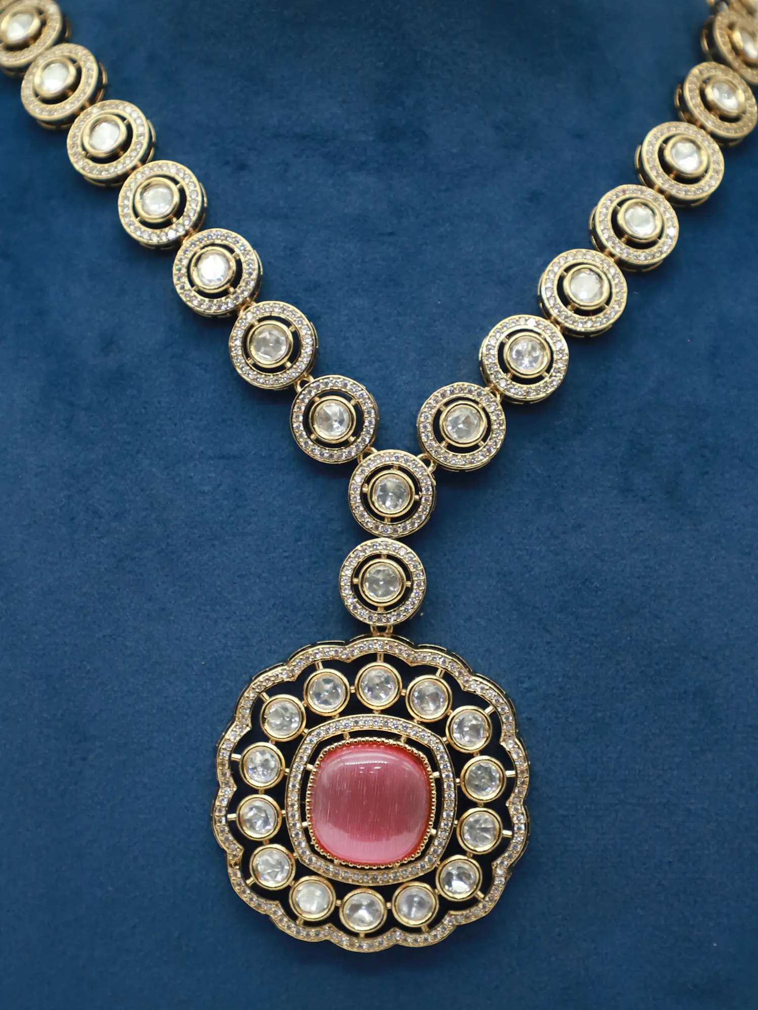 This necklace and earring set is versatile enough to complement a wide range of styles and occasions. Whether you're attending a wedding, a gala, or simply want to add a touch of glamour to your everyday look, this set will effortlessly elevate your ensemble. Pair it with a classic saree or a modern cocktail dress to create a memorable and sophisticated statement. The timeless design and exquisite craftsmanship ensure that this set will remain a cherished piece in your jewelry collection for years to come.