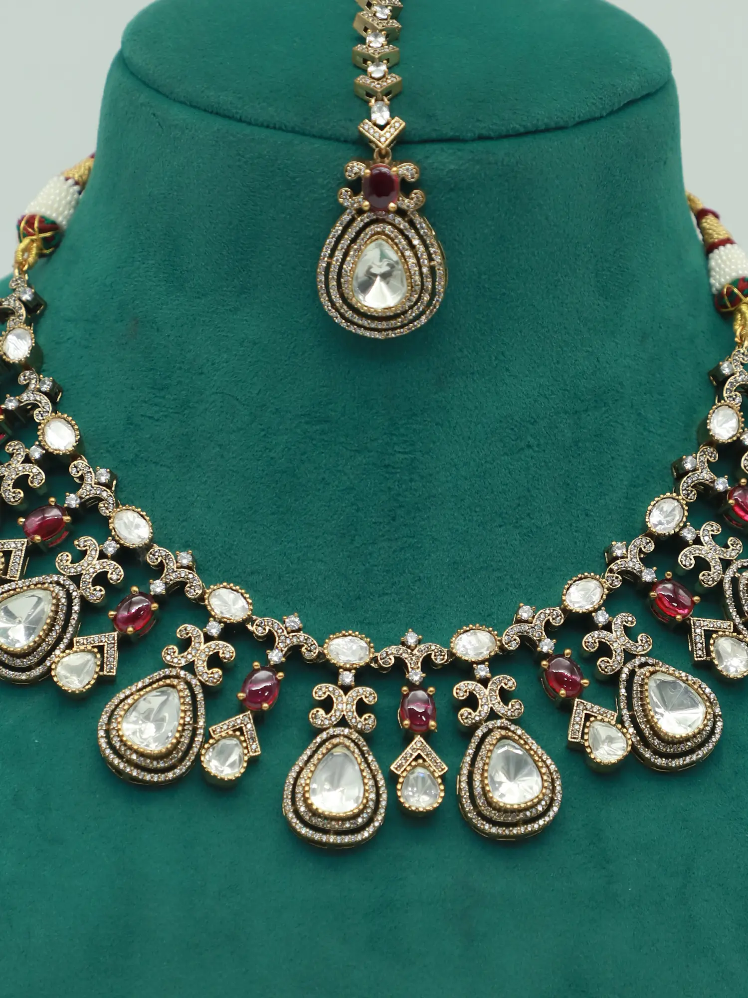 Moissanite Necklace Set with Doublet Stone Mangtika and Earrings