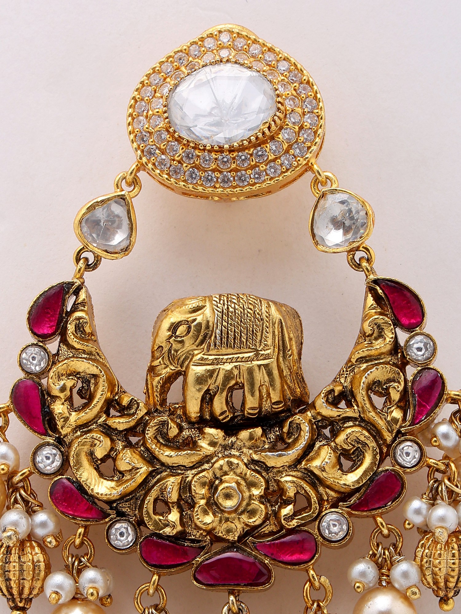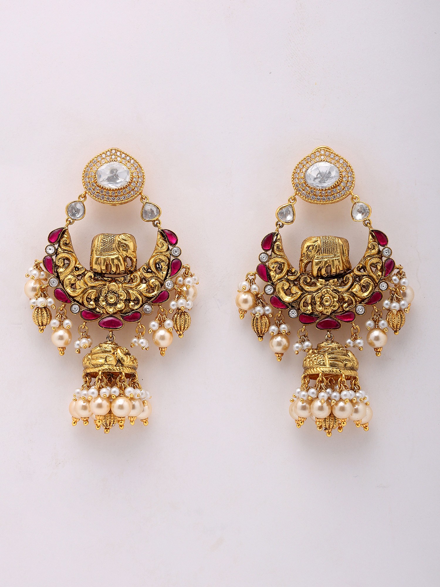 At the heart of each earring lies a beautifully sculpted elephant, a symbol of strength and good fortune, nestled within a crescent moon motif. This central piece is further enhanced by a dazzling array of precisely set semi-precious stones, including the exceptional sparkle of moissanite. These radiant stones are complemented by vibrant ruby-colored accents that add a pop of rich color and depth to the design. The craftsmanship is evident in every curve and contour, showcasing a dedication to traditional jewelry-making techniques.