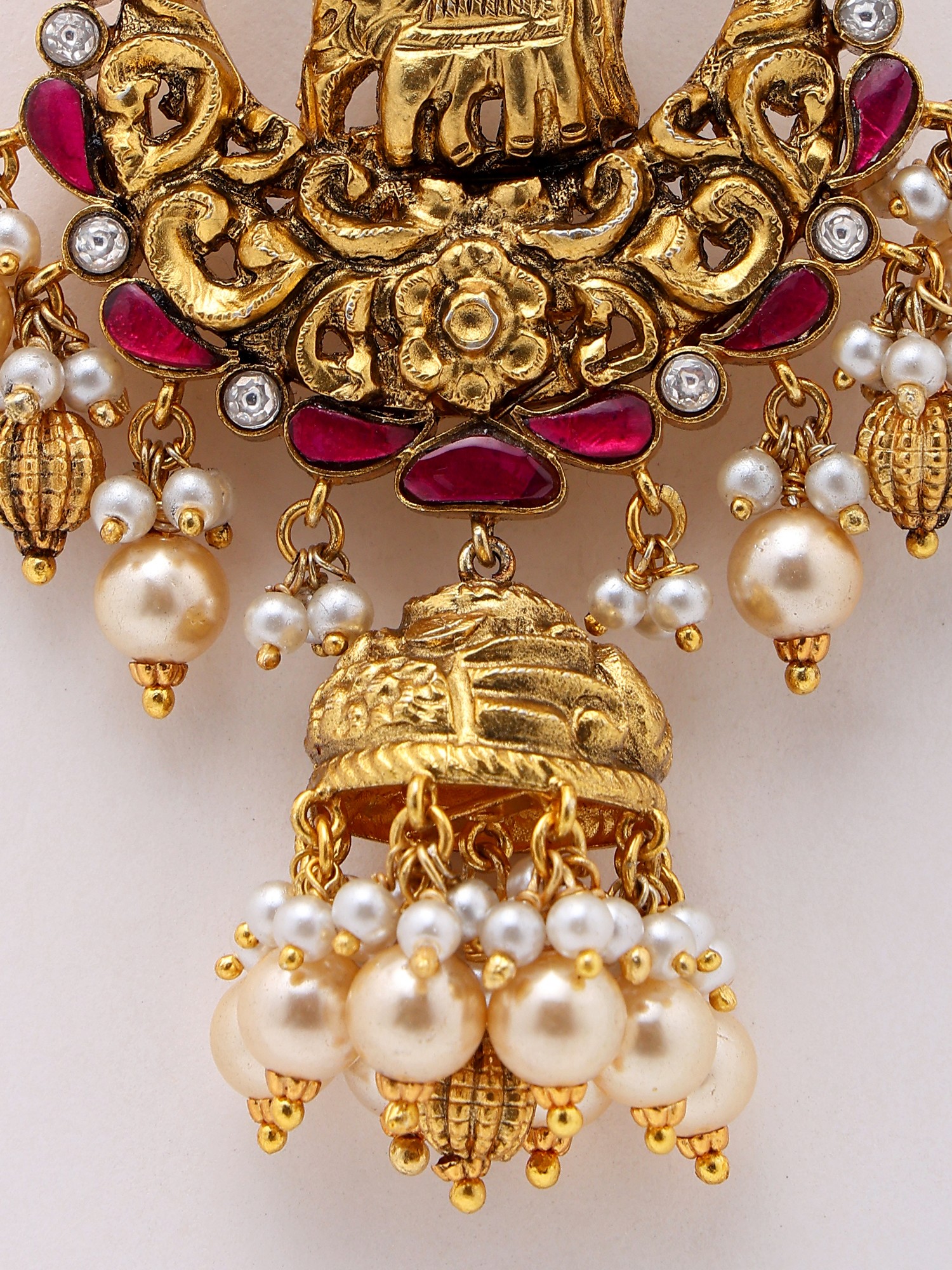 Stone Studded Goddess Lakshmi Engraved Jhumka