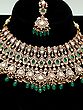 Kundan Studded Three Layered Necklace Set with Earrings and Mangtika with Beads Drop