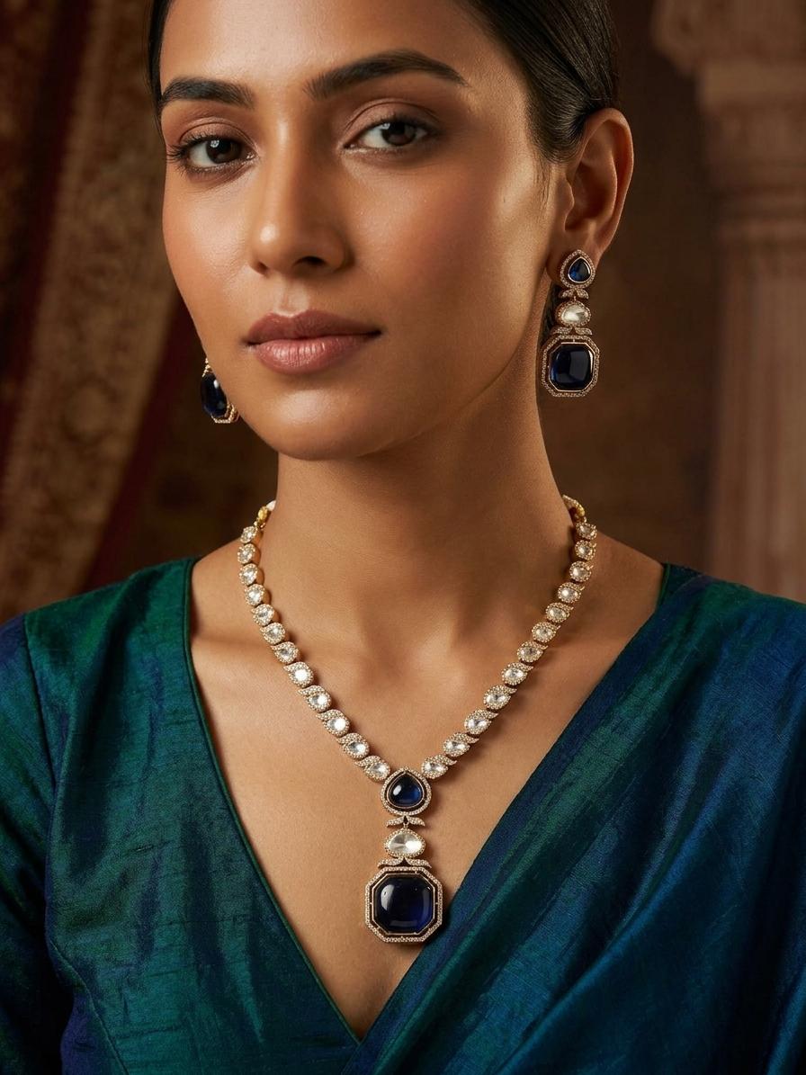 Designer Moissanite Necklace Set With Doublet Stone Mangtika And Earrings