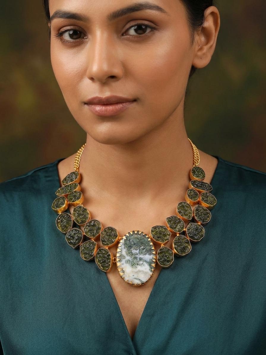 Experience the breathtaking beauty of the earth captured in a statement piece designed to captivate and enchant. This striking bib-style necklace offers a unique fusion of raw, organic forms and refined craftsmanship, promising to be a conversation starter at any occasion.