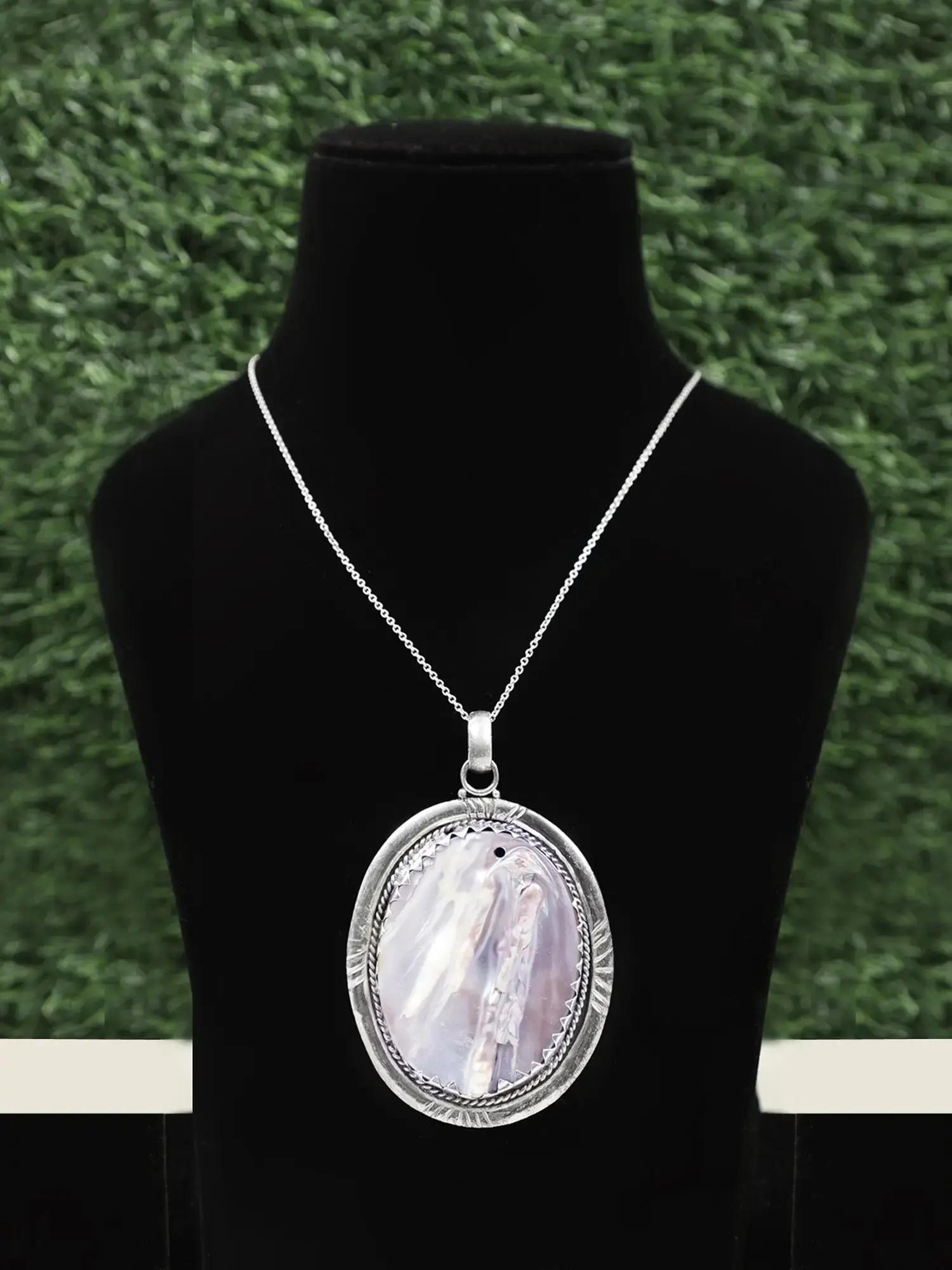 Adore yourself with timeless elegance by wearing the mother-of-pearl oval-shaped sterling silver pendant. This exquisite piece showcases a lustrous blend of sophistication and simplicity. The iridescence of the mother of pearl adds a touch of natural beauty. The pearl adds a touch of natural beauty to the pendant, while the sterling silver setting enhances its overall charm.