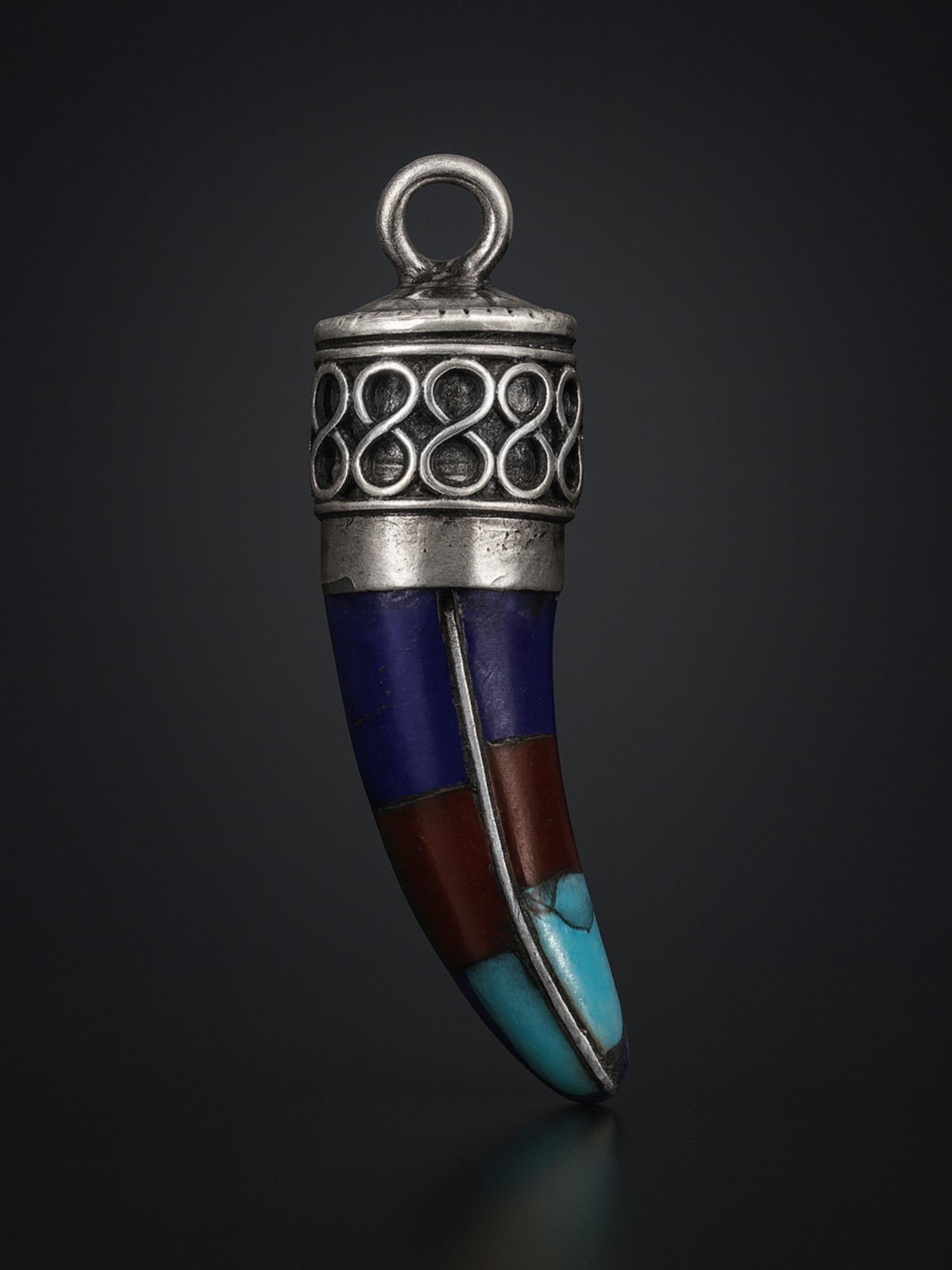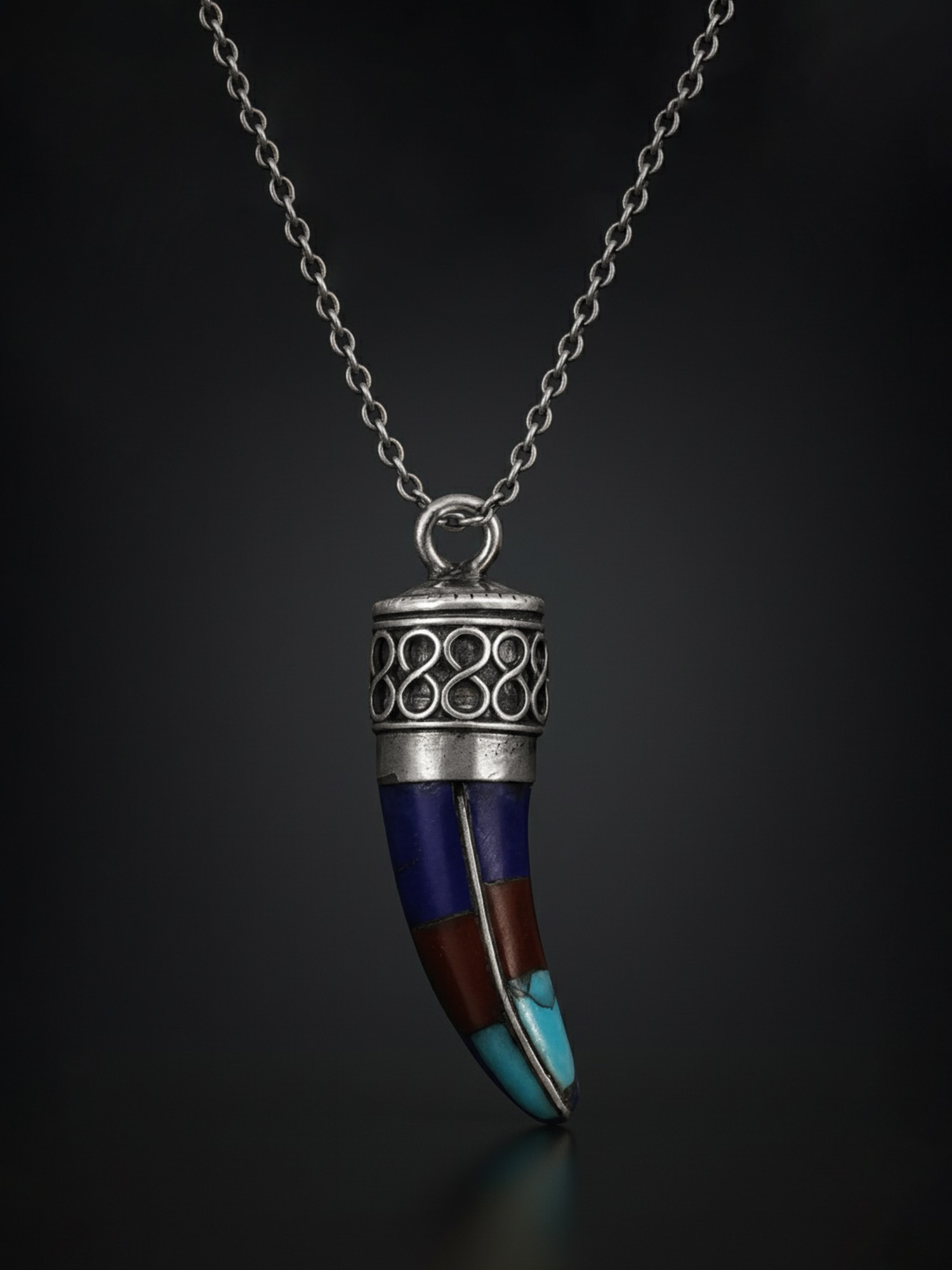 This Multi-color Inlay Claw Pendant exudes a vibrant energy, a fusion of color and form. It features a meticulously inlaid design with multicoloured stones, each bringing its own story and significance. Together, they form a mosaic of the earth's canvas, encased in a claw that speaks to the primal power and beauty of the wild. The silver cap, with its decorative filigree, adds a touch of sophistication, making this pendant not just an ornament but a piece of wearable art that carries the essence of the natural world and the craftsmanship of those who honor it.
