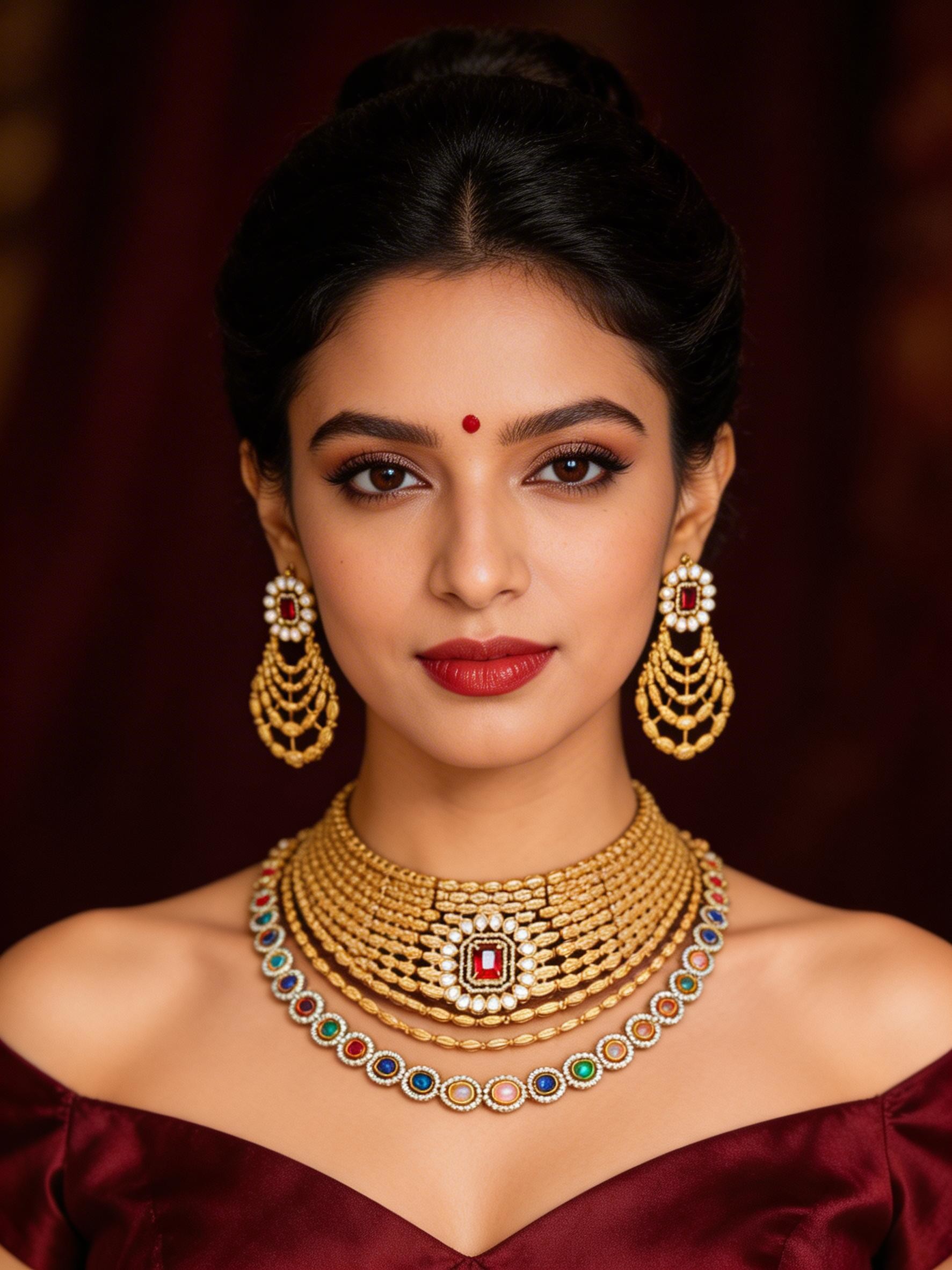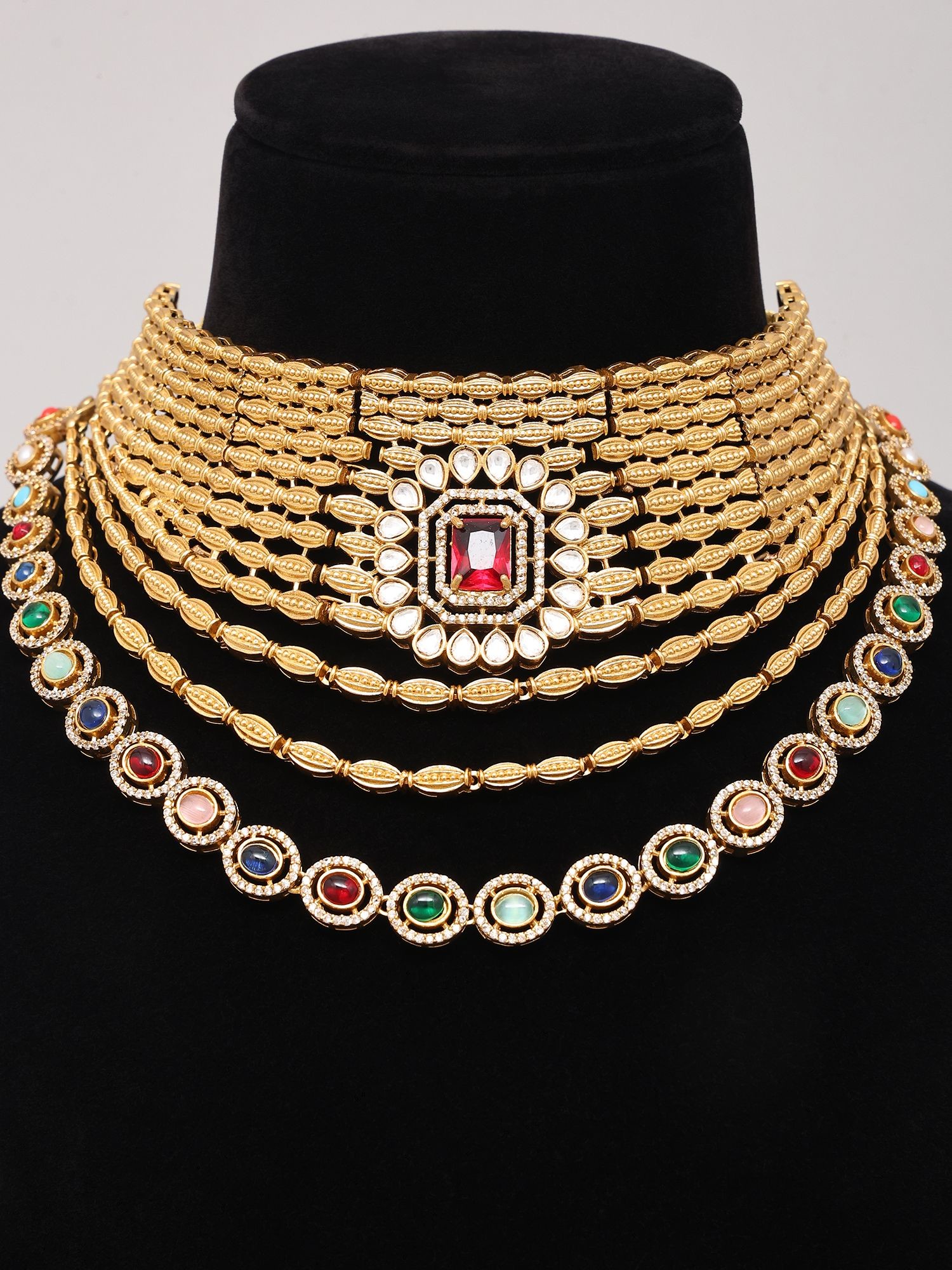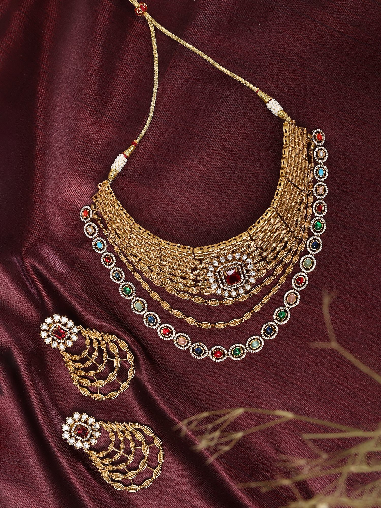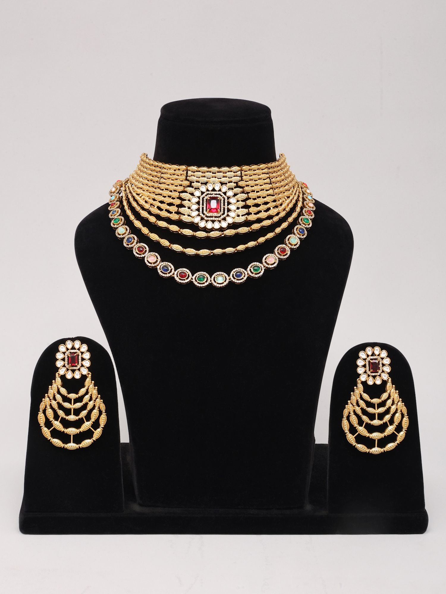 Multi-Color Navratna Kundan Stone Studded Layered Choker Necklace Set with Earrings