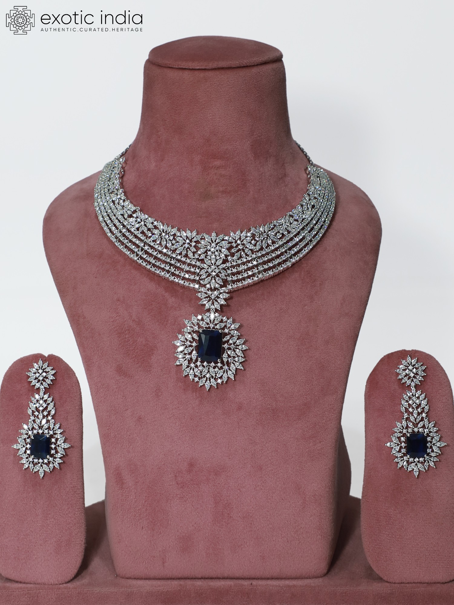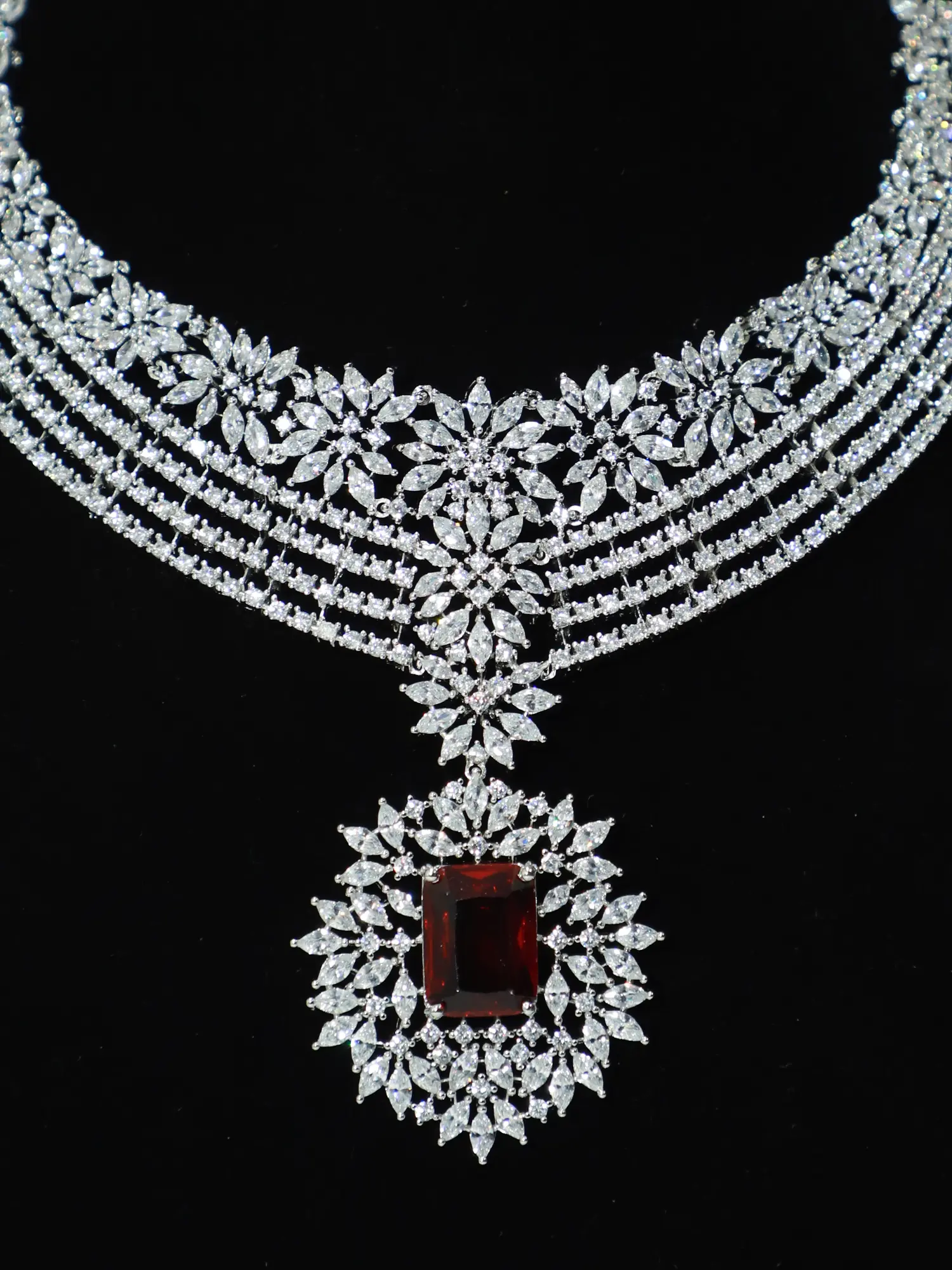 Double Layered Floral Design Stone Studded American Diamond Necklace Set With Earrings
