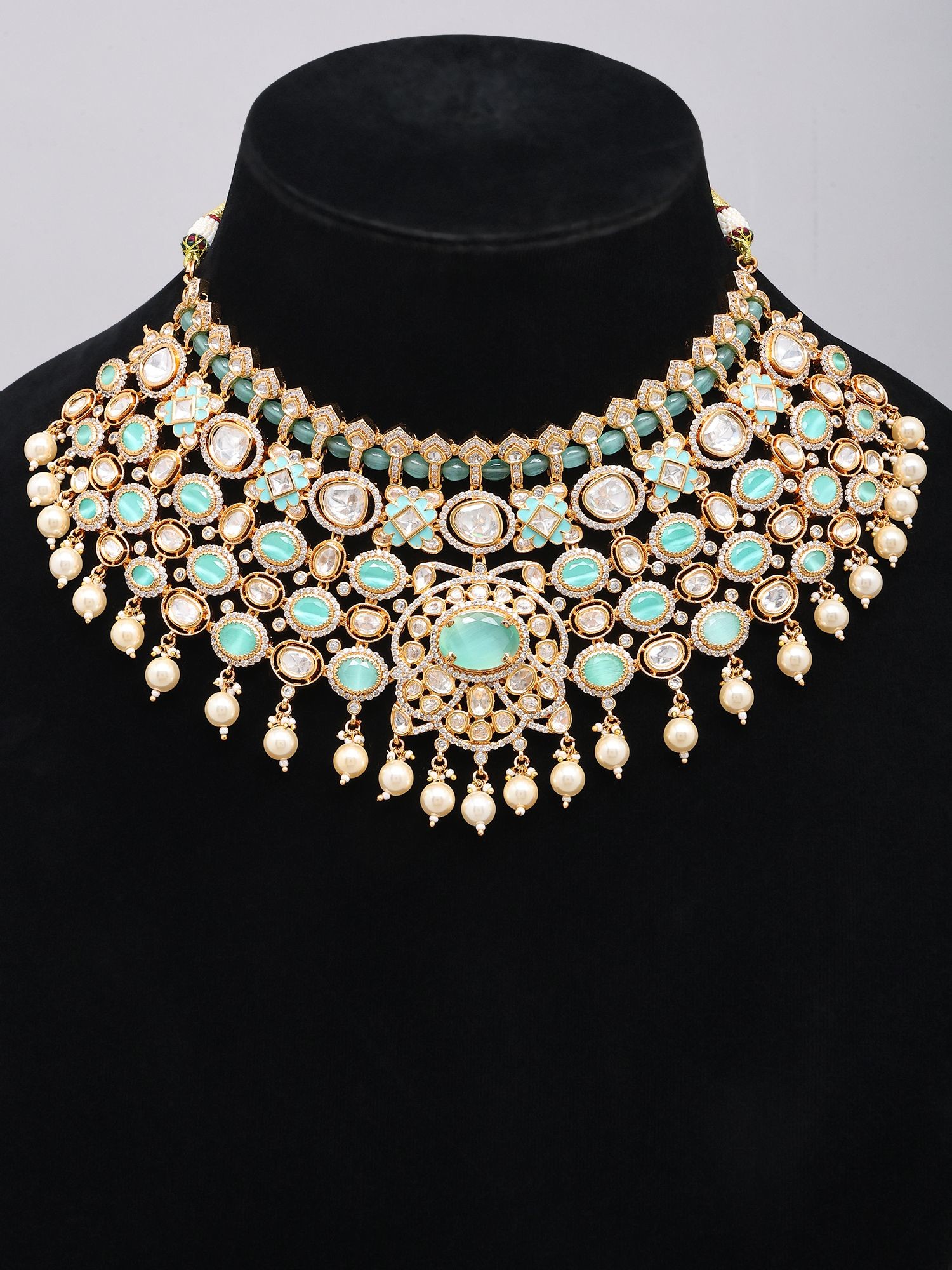 Green Polki Stone Bridal Choker Set with Earrings and Maang Tikka