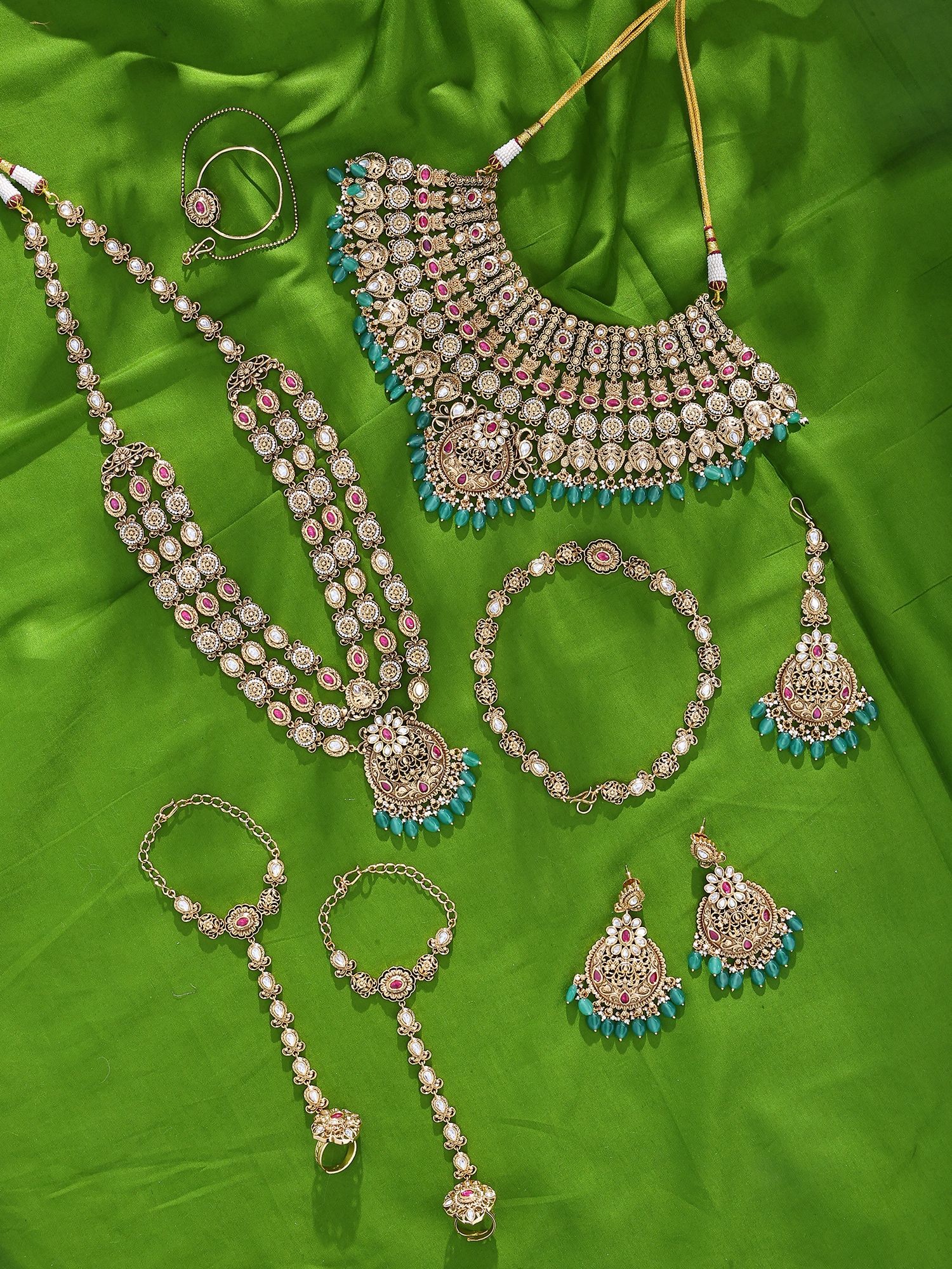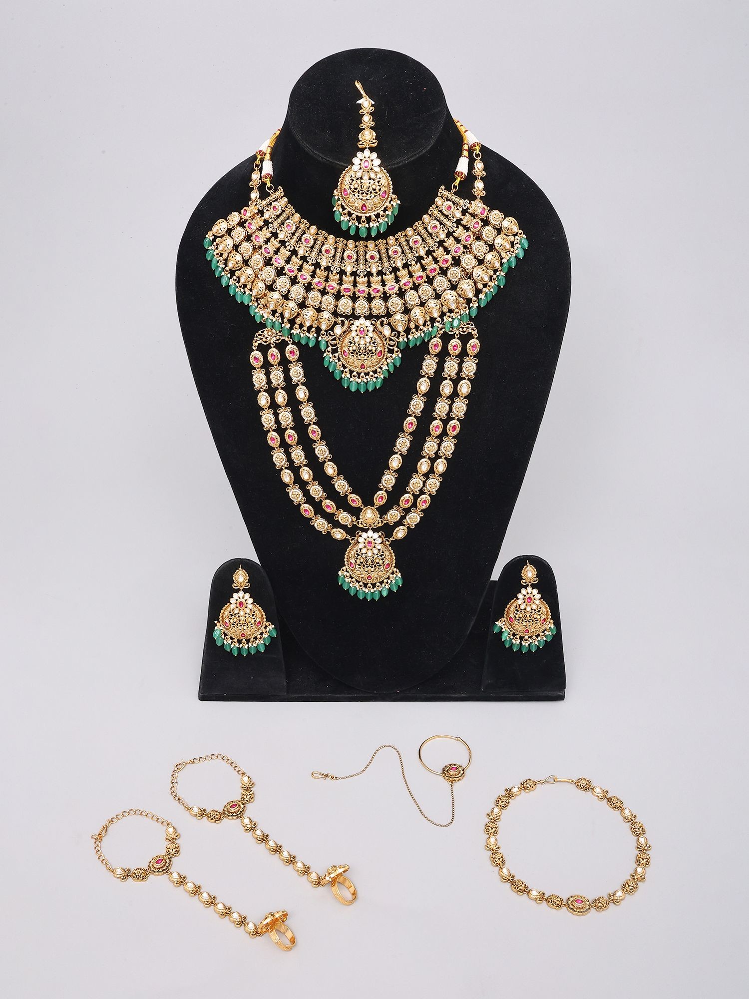 Includes a statement necklace, long haram, earrings, bracelet, and hand harness.
