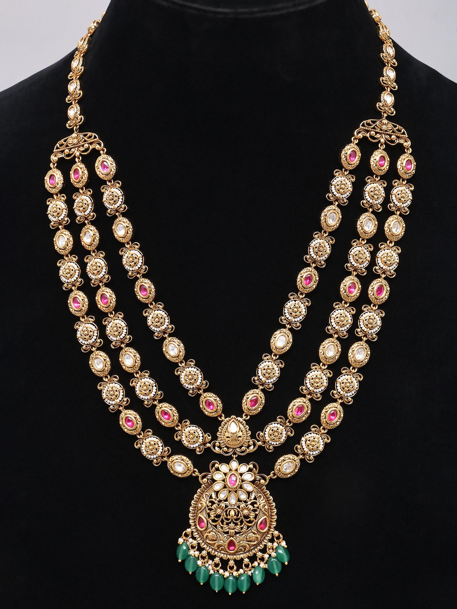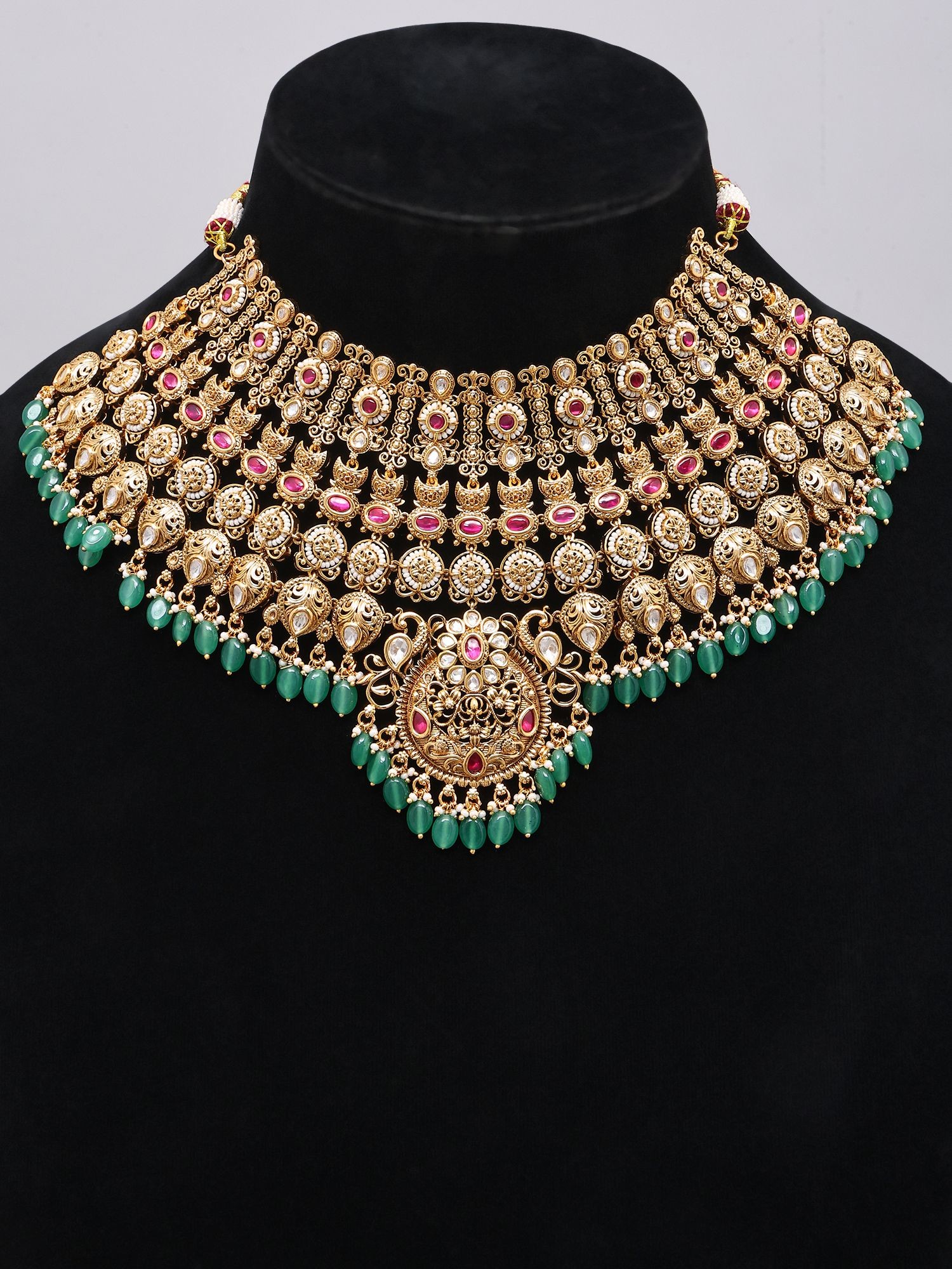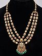 Exquisite multi-layered bridal jewelry set featuring intricate Polki stone work.