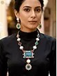 This necklace set effortlessly elevates any outfit. Its versatile design makes it perfect for both traditional and modern attire. Whether you pair it with a flowing gown for a formal occasion or a simple kurta for a more casual look, this necklace will add a touch of sophistication and elegance. The stunning sky blue centerpiece adds a unique pop of color that makes this set truly unforgettable. It’s a perfect addition to your jewelry collection, adding versatility and an instant touch of class to any look. Let this striking piece be the focal point of your ensemble, turning heads and sparking conversations wherever you go.