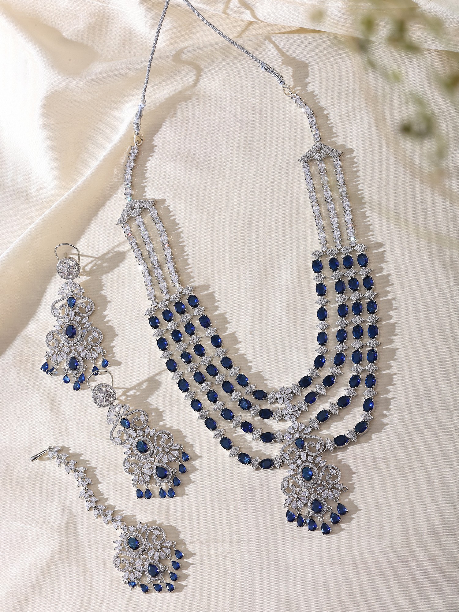 Multi Strand Oval Cut American-Diamond Bridal Necklace Set with Maang Tikka