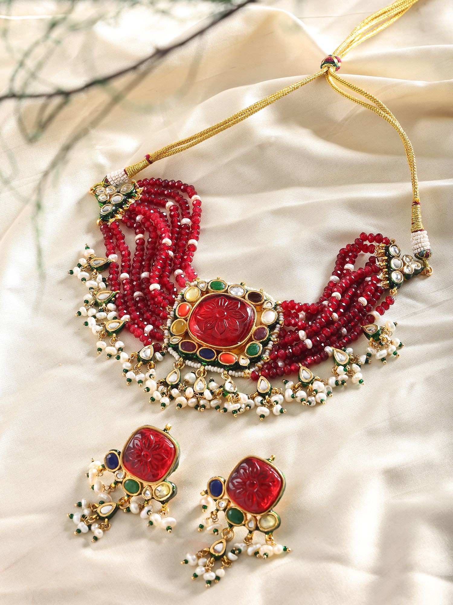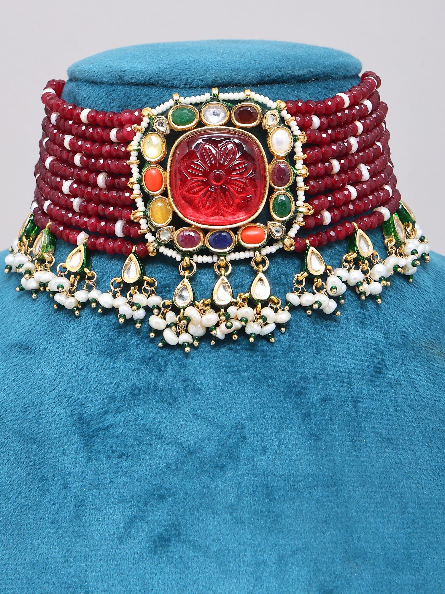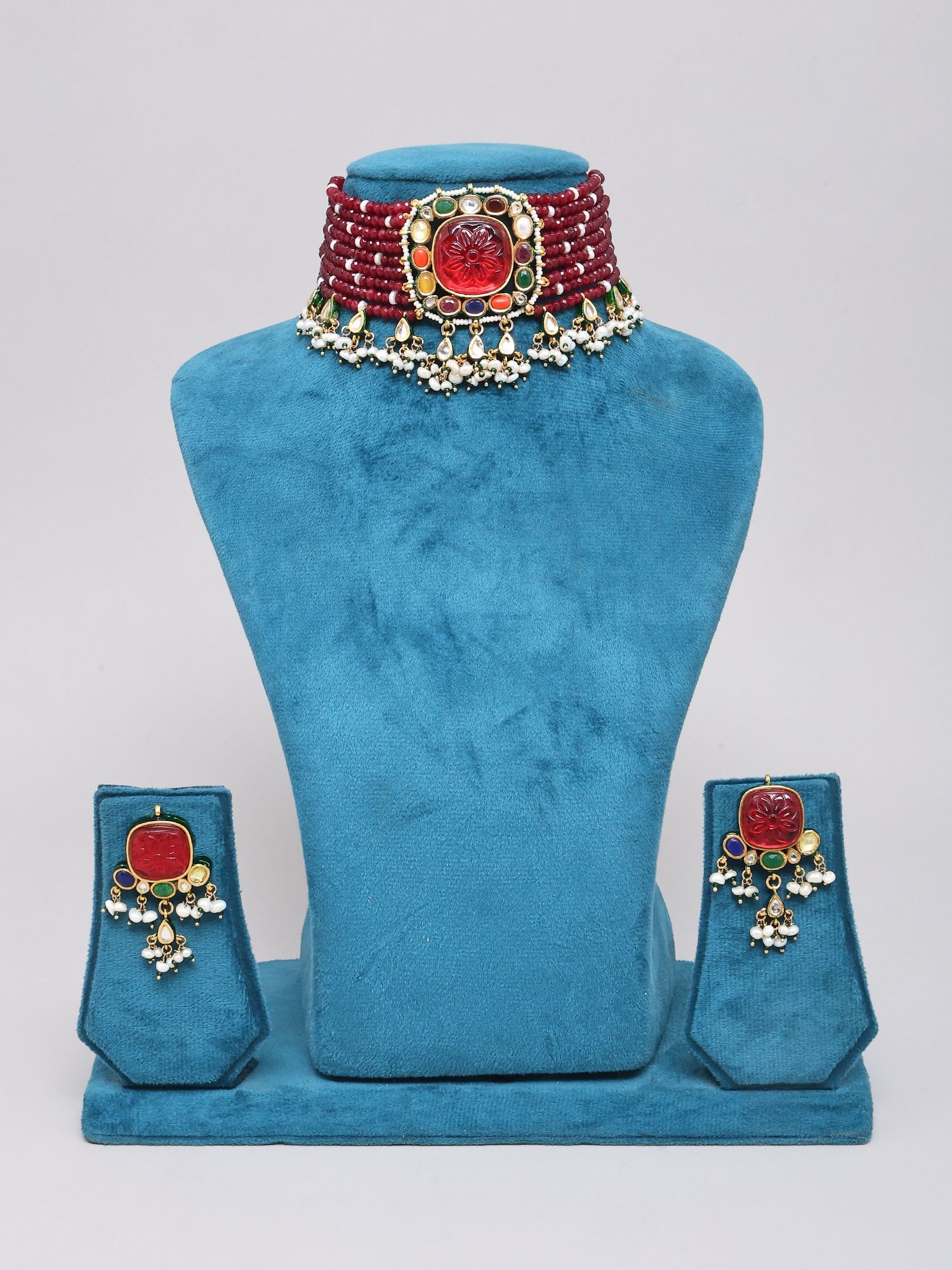 The choker itself, measuring approximately 2.7 inches in length and 8.7 inches in width, is a masterful arrangement of multiple strands of deep crimson beads, interspersed with delicate pearls. Its centerpiece is a breathtaking carved red stone, surrounded by a vibrant mosaic of smaller, multi-colored gemstones that evoke the spirit of Navratan jewelry. Complementing the choker are the earrings, each standing about 2.2 inches high and 1.1 inches wide. These feature smaller, intricately carved red stones mirroring the choker's main motif, elegantly suspended with pearl drops. The adjustable dori allows for a personalized and comfortable fit, ensuring it sits perfectly against your décolletage.