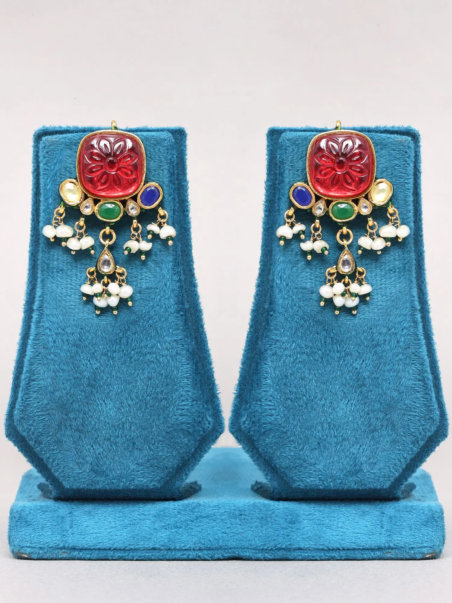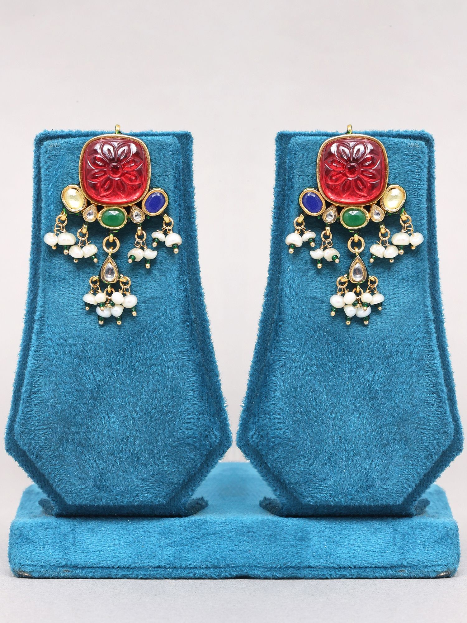 Features a striking red carved central stone, reminiscent of a Navratan design.