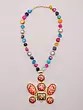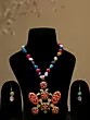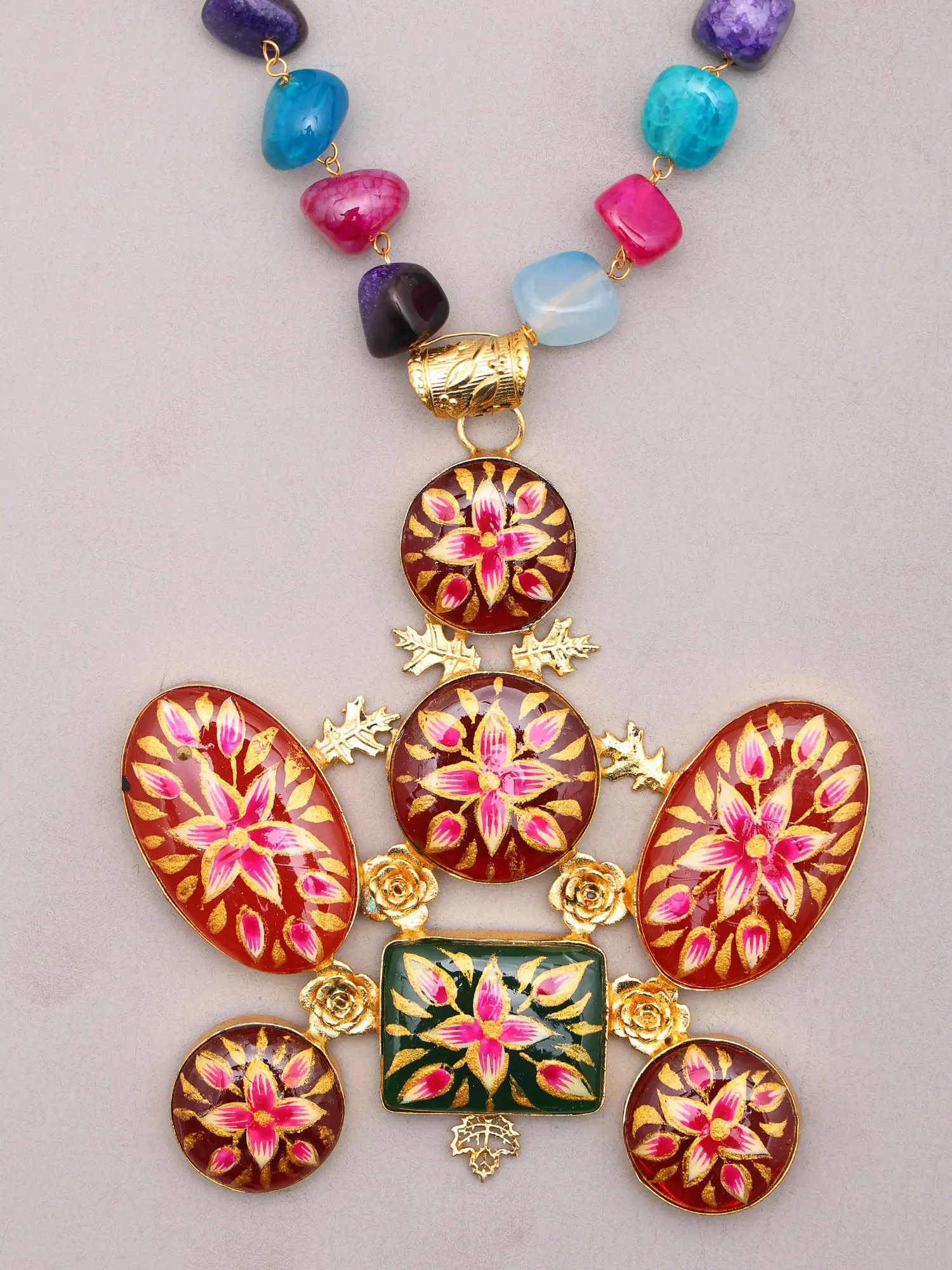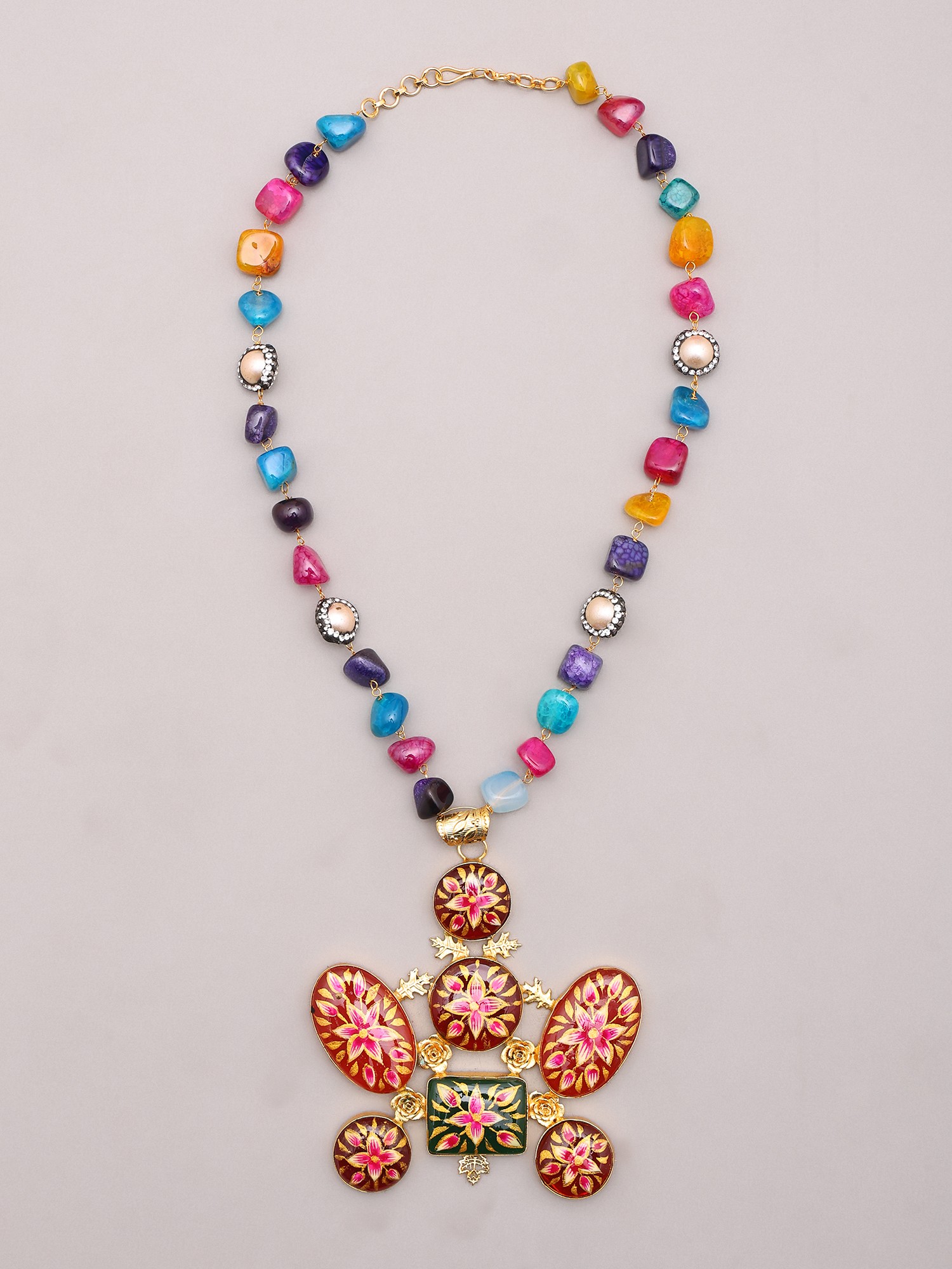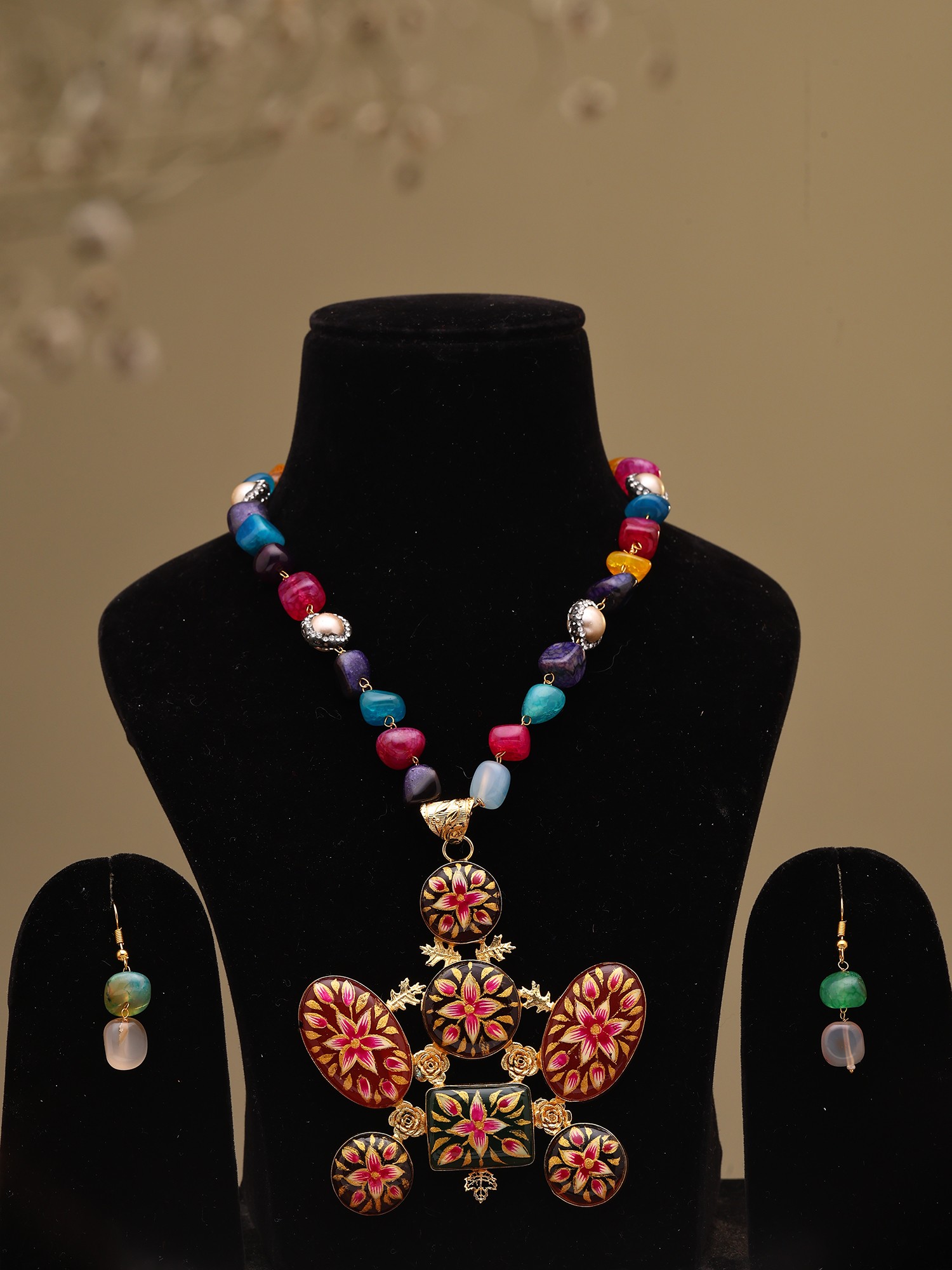 Multicolor Stone Beaded Necklace Set with Floral Enamel Pendant and Earrings
