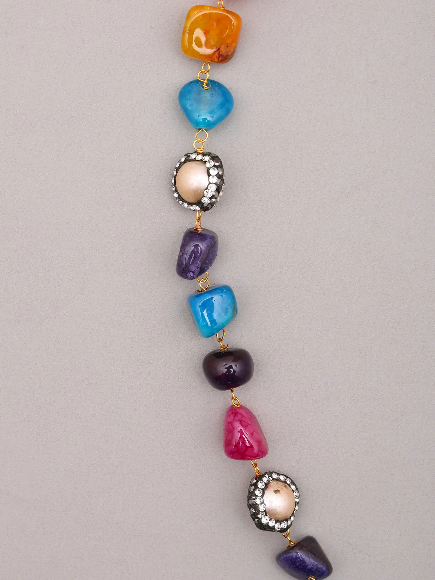 Adorn yourself with a masterpiece that blends the vibrant hues of nature with the intricate artistry of traditional design. This exquisite necklace set is a celebration of color, texture, and meticulous craftsmanship, designed to captivate and enchant. The necklace features a captivating array of natural stones, each chosen for its unique shape, size, and brilliant color. From deep blues and purples to fiery reds and sunny yellows, the stones are meticulously strung together, creating a lively and dynamic cascade that draws the eye. Interspersed among these natural gems are delicate pearls and shimmering accents, adding a touch of refined elegance and subtle sparkle.