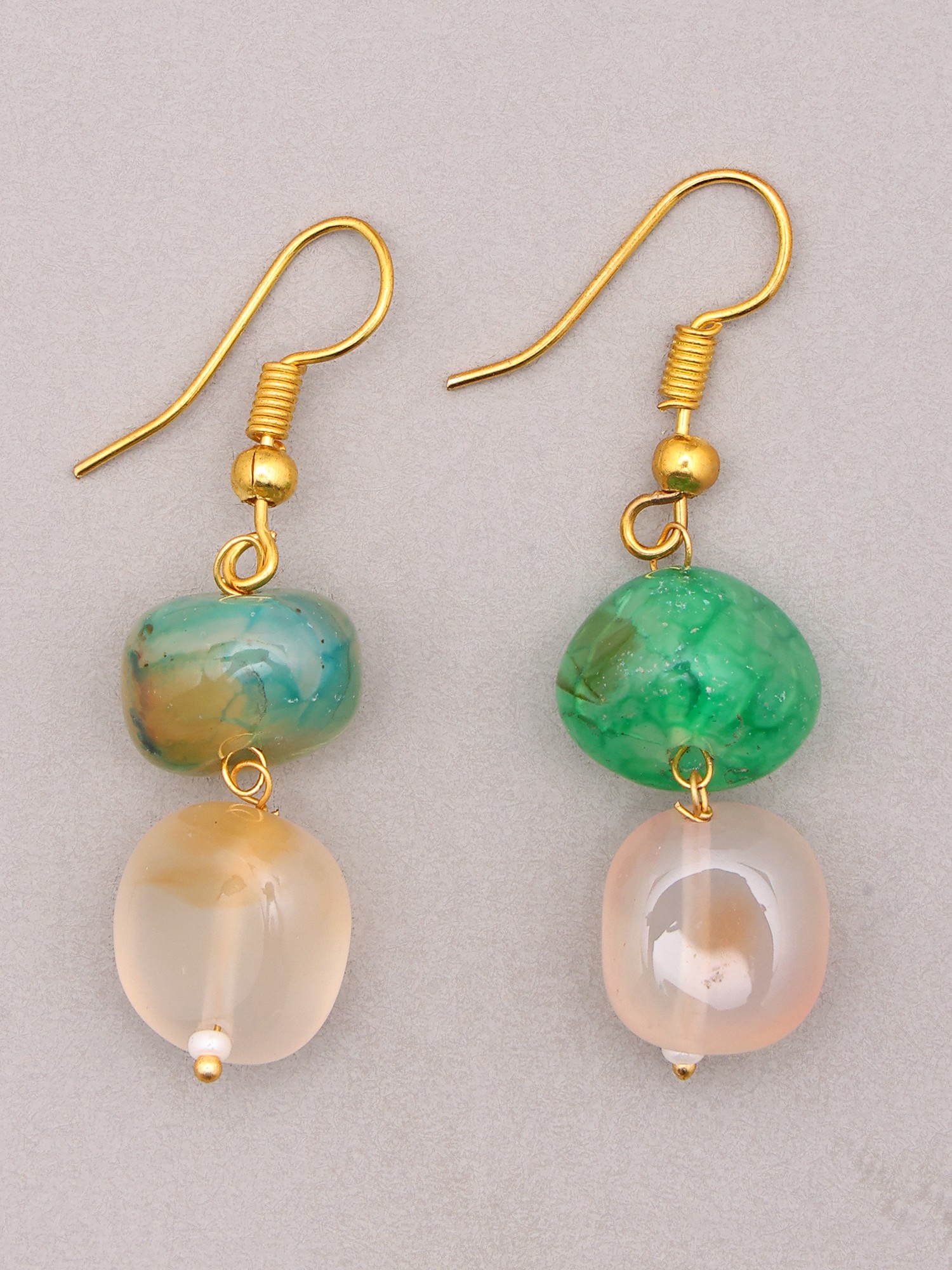 Completing this captivating ensemble are a pair of matching earrings, designed to echo the necklace's charm. Each earring features a carefully selected pairing of natural stones, mirroring the serene greens and soft pinks found in nature. These stones, smoothly polished and elegantly suspended, offer a subtle yet striking complement to the bold statement of the necklace. Their design is delicate and refined, ensuring they add a touch of understated glamour without overpowering the overall look. Together, the necklace and earrings create a cohesive and stunningly beautiful set, perfect for adding a touch of artisanal luxury to any occasion. This set is more than just jewelry; it's a statement of individuality and an appreciation for timeless beauty.