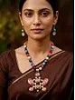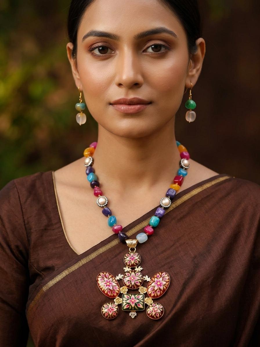 Adorn yourself with a masterpiece that blends the vibrant hues of nature with the intricate artistry of traditional design. This exquisite necklace set is a celebration of color, texture, and meticulous craftsmanship, designed to captivate and enchant. The necklace features a captivating array of natural stones, each chosen for its unique shape, size, and brilliant color. From deep blues and purples to fiery reds and sunny yellows, the stones are meticulously strung together, creating a lively and dynamic cascade that draws the eye. Interspersed among these natural gems are delicate pearls and shimmering accents, adding a touch of refined elegance and subtle sparkle.