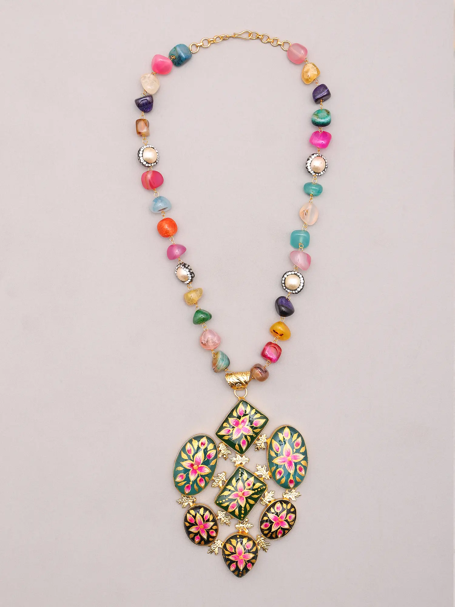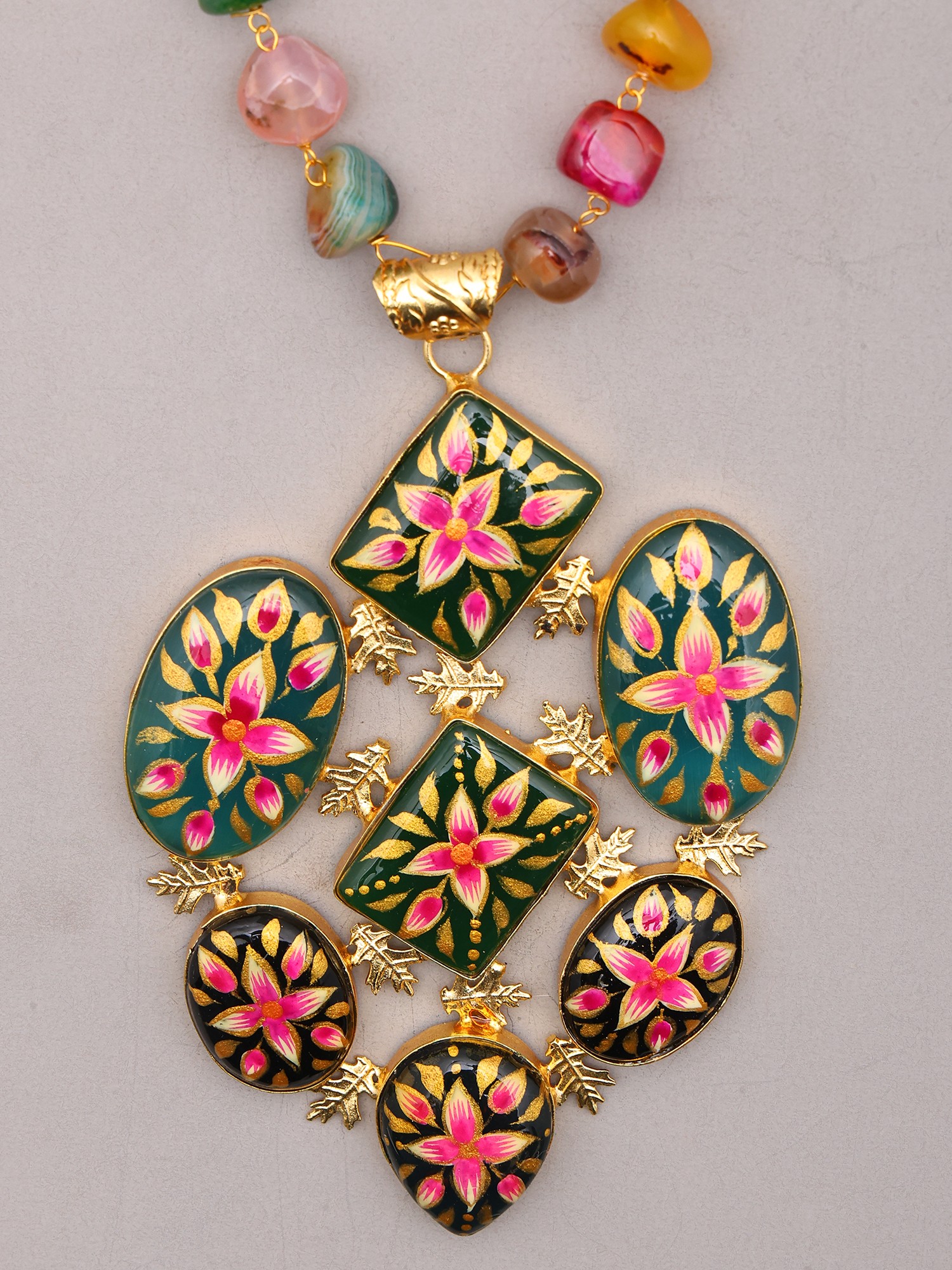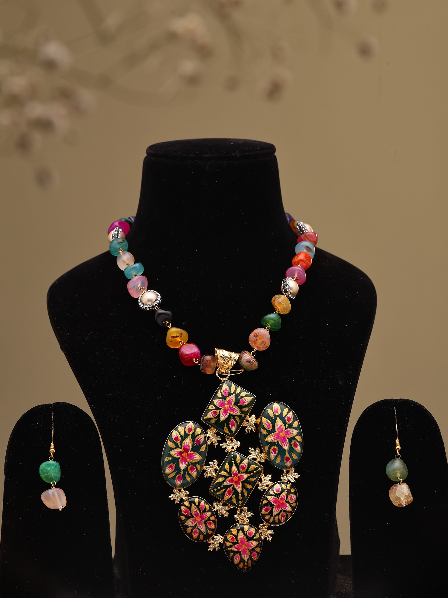 Multicolor Stone Beaded Necklace Set with Floral Enamel Pendant and Earrings
