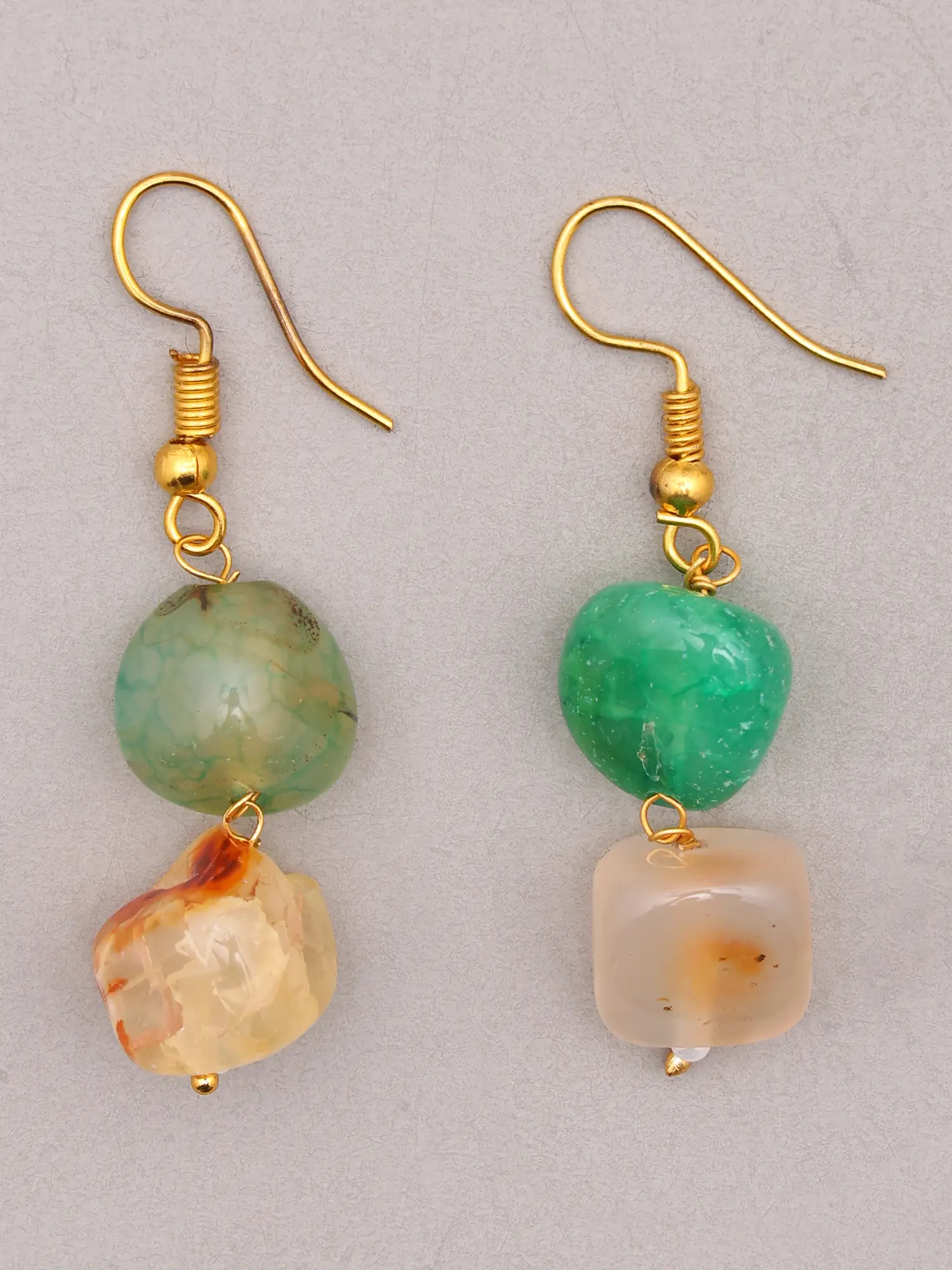 Complementing the necklace are a pair of equally striking earrings. These earrings echo the sophisticated aesthetic of the main piece, featuring a similar arrangement of natural stones and a subtle elegance. Each earring suspends two smooth, polished stones in complementary shades, offering a delicate dangle that catches the light with every movement. The stones are carefully chosen to harmonize with the necklace's color palette, ensuring a cohesive and polished look. The simple yet elegant brass hooks ensure comfortable wear, allowing the beauty of the stones to take center stage. This set is designed to be worn together for a complete, impactful statement or as individual pieces to add a touch of artistic flair to any outfit. Whether you're dressing for a special occasion or adding a touch of handcrafted beauty to your everyday wear, this necklace and earring set promises to be a treasured addition to your jewelry collection.