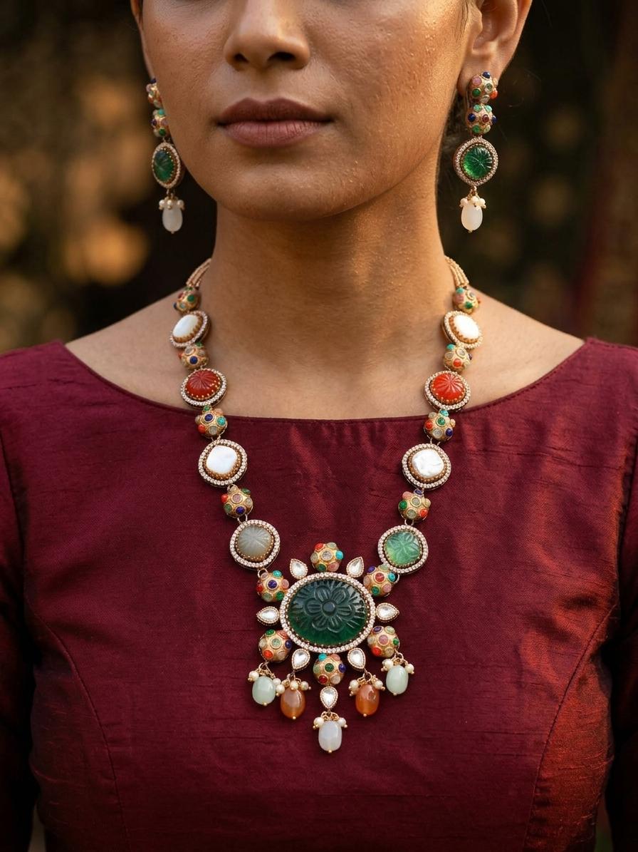 This exquisite necklace and earrings set is a masterpiece of handcrafted artistry, designed to add a touch of regal splendor to your special day. The vibrant hues and intricate detailing create a captivating ensemble that's perfect for brides seeking a unique and unforgettable look. The necklace's cascading design features a stunning array of multicolored stones, expertly set in a polished brass frame. Each stone is meticulously chosen for its brilliance and vibrancy, contributing to the overall breathtaking beauty of the piece. The central focal point, a large, intricately carved green stone pendant, commands attention with its deep, rich color and detailed craftsmanship. It's a true testament to the skill and dedication of the artisans who brought this piece to life. The earrings perfectly complement the necklace, echoing the design's vibrant colors and intricate details in a smaller, yet equally stunning scale.