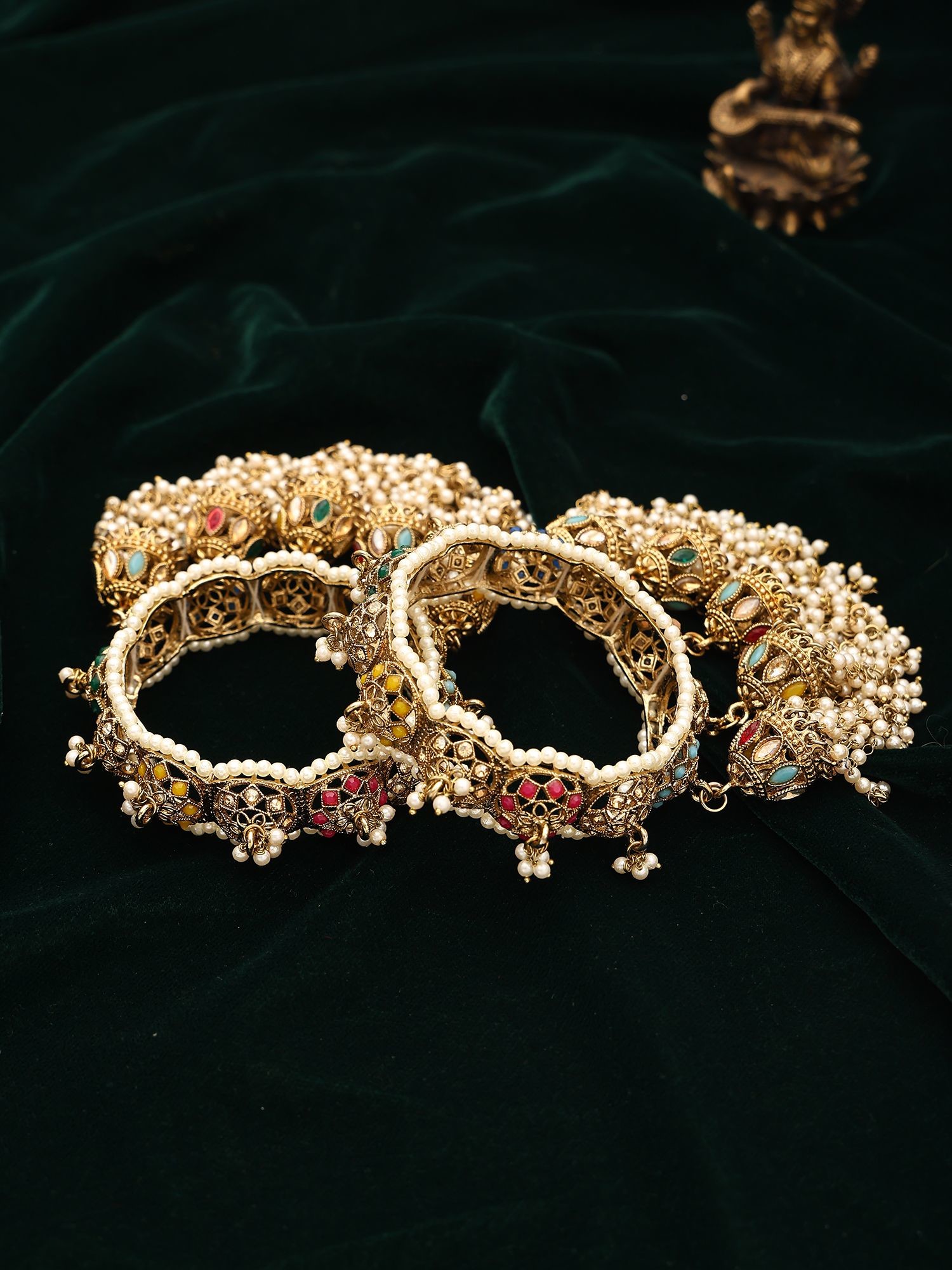 Adorn your wrists with this stunning pair, featuring a rich interplay of colourful Polki stones set against a lustrous brass base. The delicate pearl encrusting along the edges adds a touch of opulence, while the suspended jhumka-style charms, accented with tiny pearls, create a captivating dance of light and movement. The size 2/4 ensures a comfortable yet secure fit, allowing you to revel in their beauty without compromise.