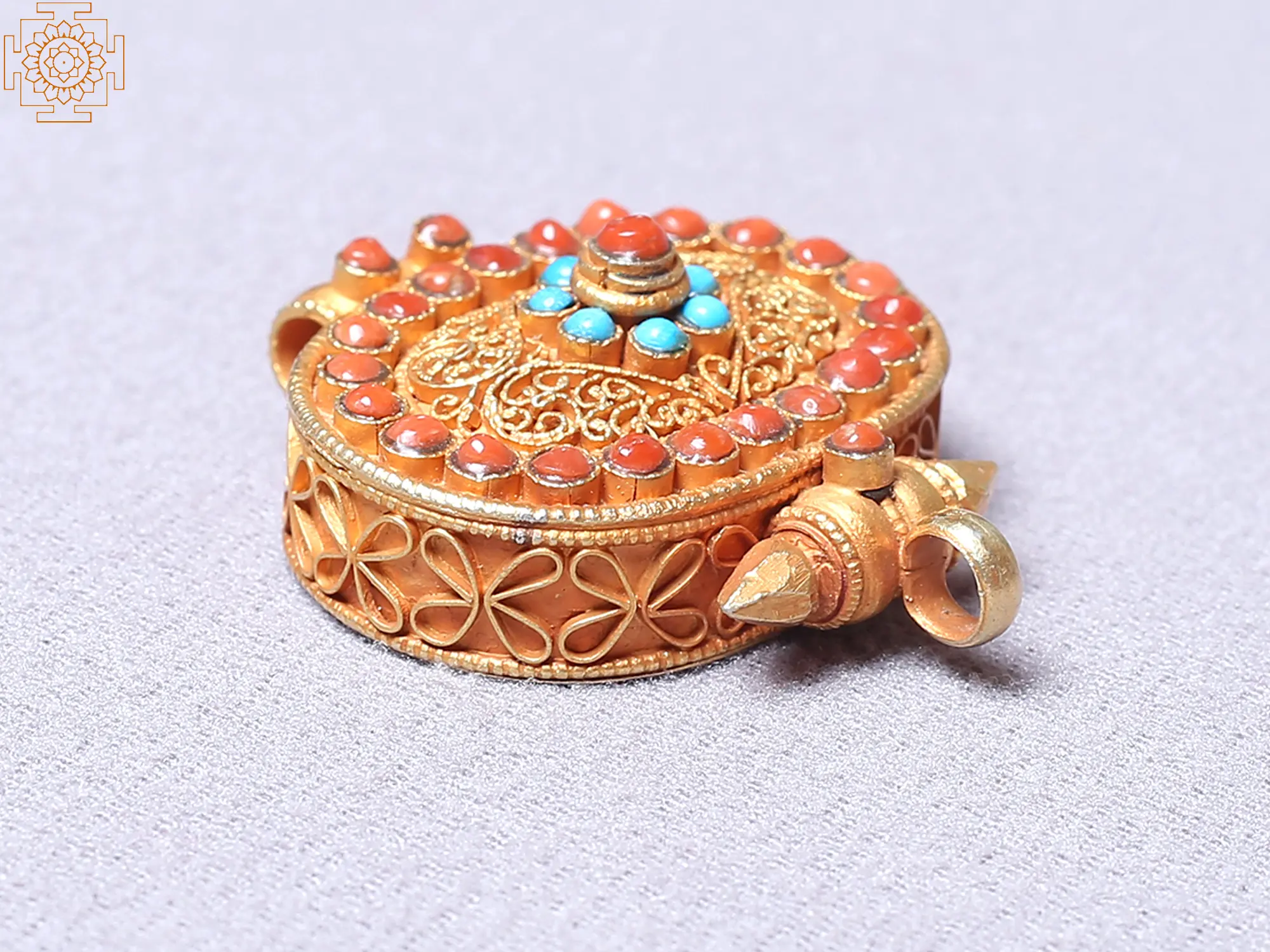 This exquisite pendant is a one-of-a-kind piece of jewelry that combines the vibrant brilliance of red coral with the serenity of turquoise. The silver necklace's face is tastefully decorated with little turquoise stones arranged in the shape of a flower. The red dot is encircled by turquoise stone arranged in a petal form. There are additional floral designs constructed from silver wires available. The pendant is a classic Ghau style, with a little pocket for carrying prayer scrolls. On the reverse of the pendant, a double Dorje emblem emphasizes the object's sacredness even more. They are only ordinary pieces of jewelry when worn without the prayer scrolls, but when blessed with the scrolls, they become a wonderful method of connecting with the divine.