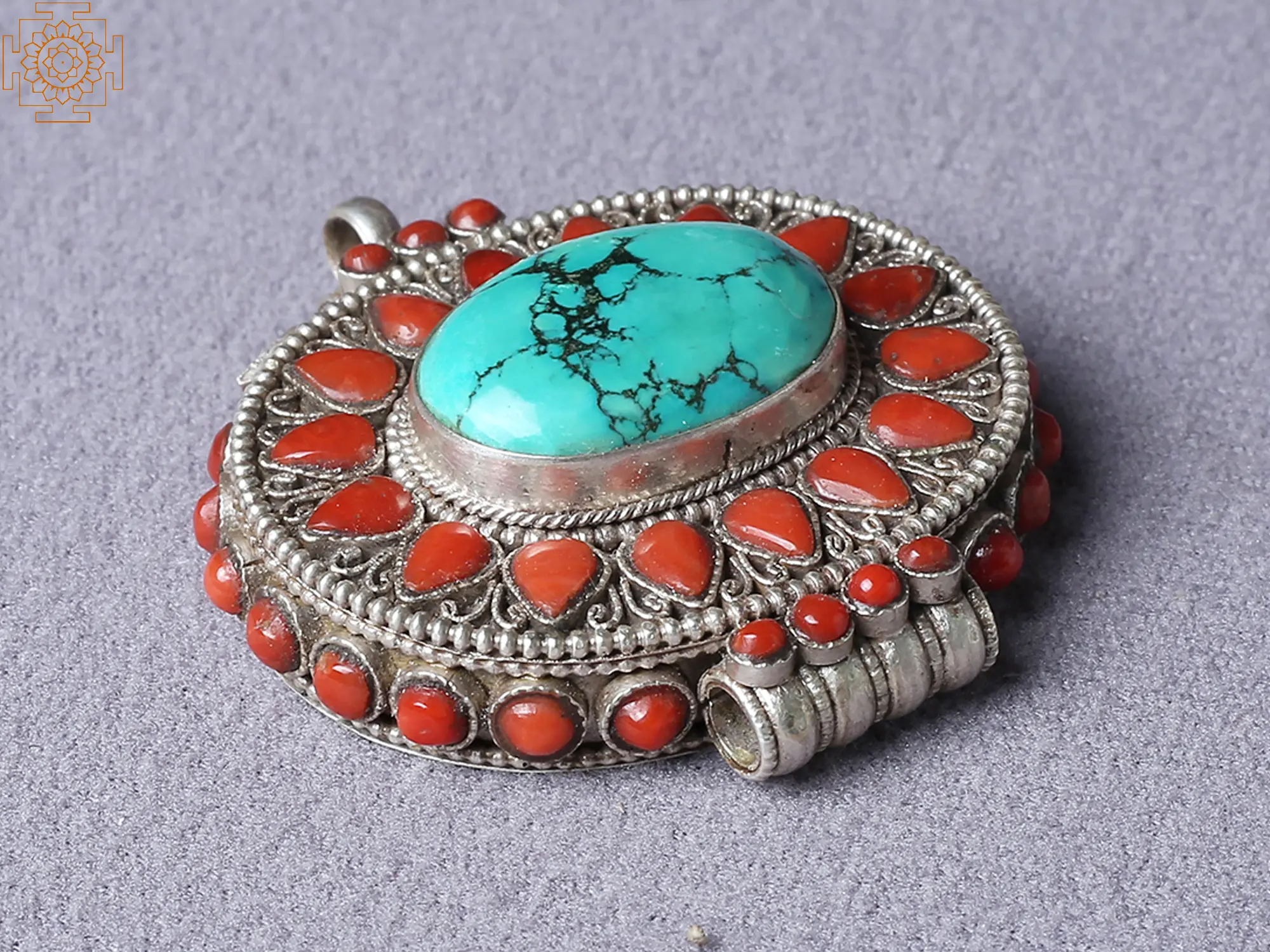 This gorgeous pendant is a unique piece of jewelry that combines the vibrant beauty of the red coral with the serenity of turquoise. The two stones used here are also opposite energy holders, the coral represents fire and the turquoise is connected to water. The pendant's face is exquisitely adorned with a large turquoise stone in the center surrounded by tiny red corals arranged like flowers. The coral petals are surrounded by floral designs created with silver wires.